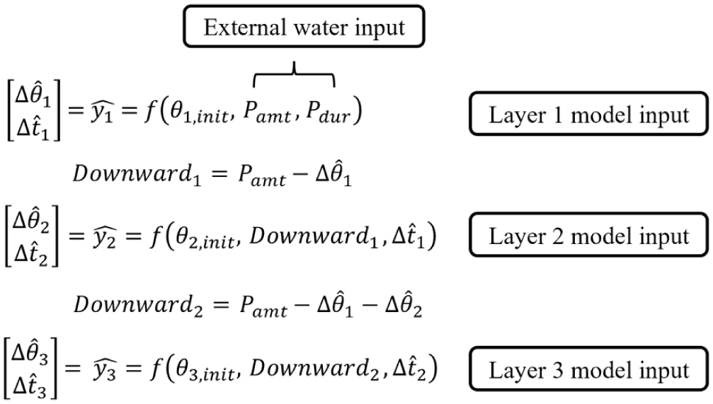 This section presents a modeling approach that integrates the physical water balance equation with a machine learning algorithm to estimate soil moisture increase due to surface water input. The model simulates how surface input redistributes vertically across soil layers during short infiltration events. Layered water balance equations provide structural inputs to the XGBoost model, where soil moisture change in each layer is estimated as a function of incoming water, antecedent moisture, and interlayer connectivity.