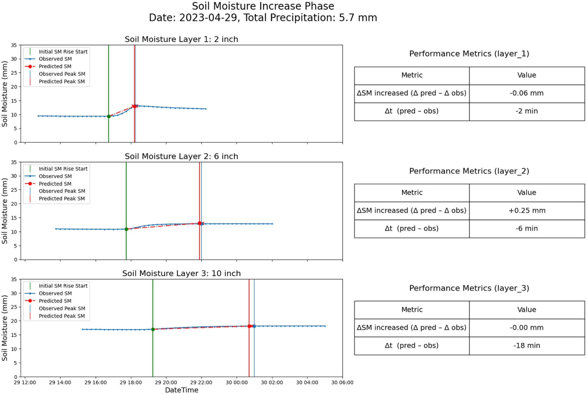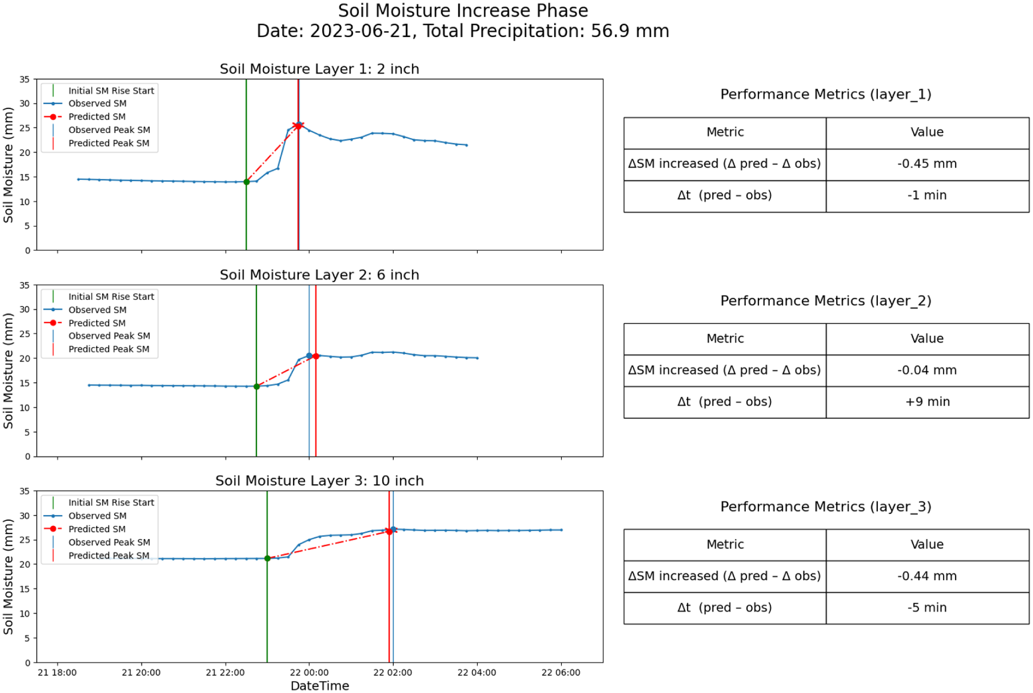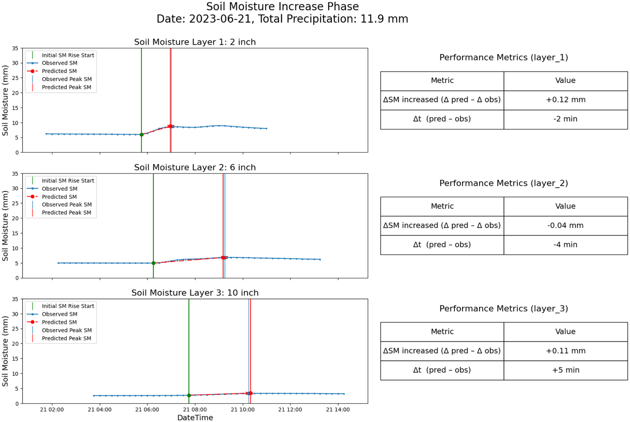 Quantitative metrics in Figure 8 further confirm this depth-dependent behavior. RMSE results in Figures 5 to 7 show that the surface model (Model 1) achieves the lowest timing error (1.85 min) but has the highest moisture amount error (5.83 mm), likely due to high surface variability. In contrast, the deep layer model (Model 3) shows greater timing error (2.95 min) but lower moisture error (3.54 mm), suggesting slower but more stable infiltration. These contrasting gradients are consistent with the model’s design and physical layering.