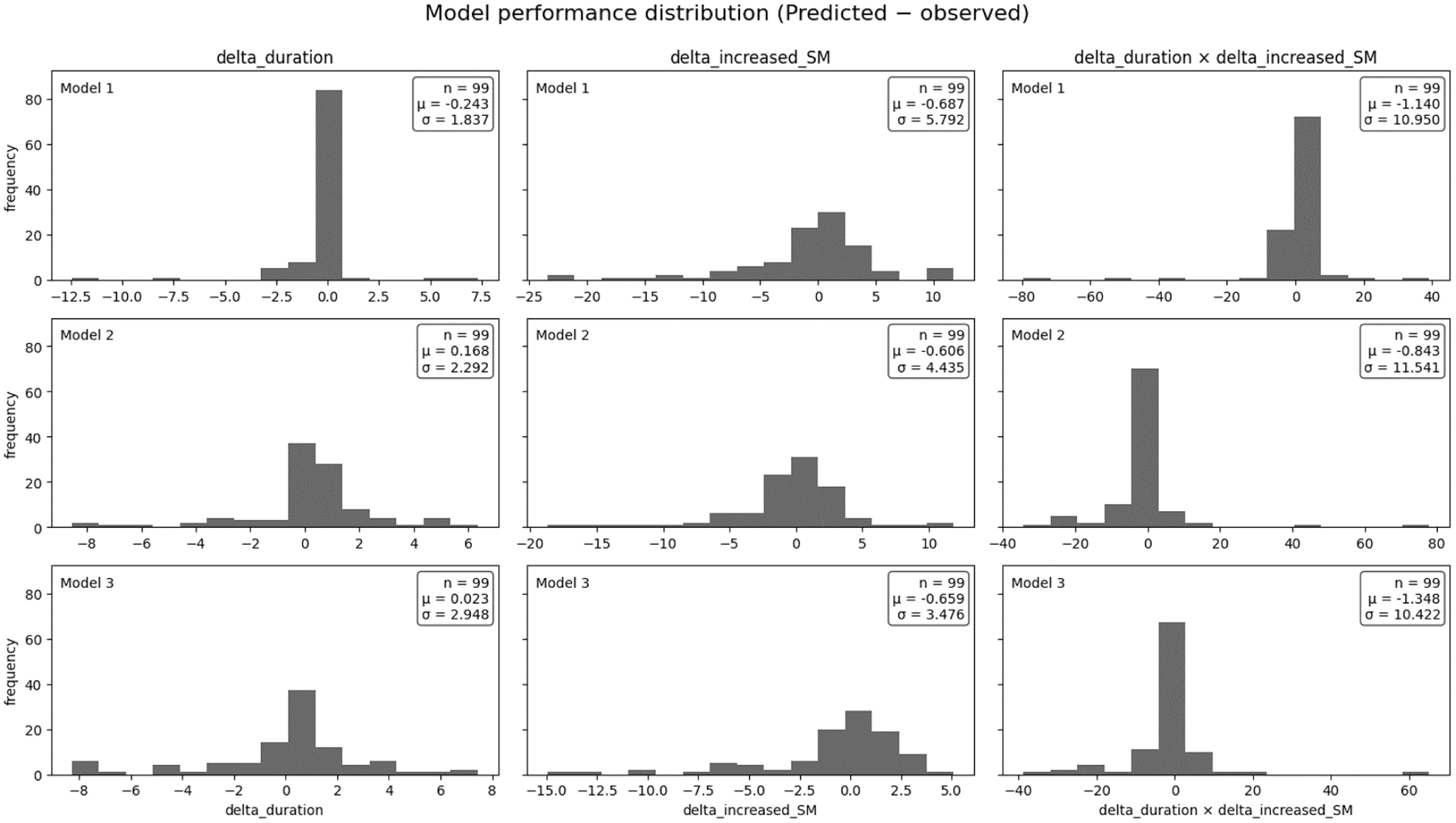 Figure 8 illustrates the model’s overall performance through histograms of three error metrics: duration error (Δ duration), soil moisture increase error (Δ SM), and their product (Δ duration × Δ SM). All three error types are clustering around zero, indicating minimal systematic bias. While the mean error (