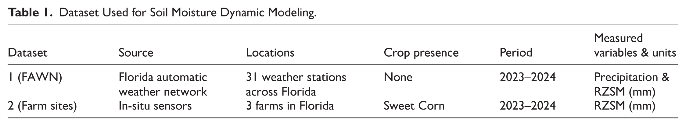 This study utilizes two distinct datasets. Dataset 1 comprises weather and soil moisture data collected from 31 locations within the FAWN. This dataset originates from weather stations without planted crops. Dataset 2 includes weather and soil moisture data from three farms planted with sweet corn situated within Florida. The weather data for those farms is acquired from the nearest weather station of FAWN. Soil moisture was measured in soil water amount (equivalent water depth (mm)) at 2, 6, and 10 in below the ground using soil moisture probes (Sentek Drill & Drop™, Sentek Technologies, Adelaide, Australia; See Appendix for details). To facilitate the water-balance modeling, the key measurements for water balance model, precipitation and soil moisture values, are converted to an equivalent water depth (mm). The dataset structure is shown in Table 1.