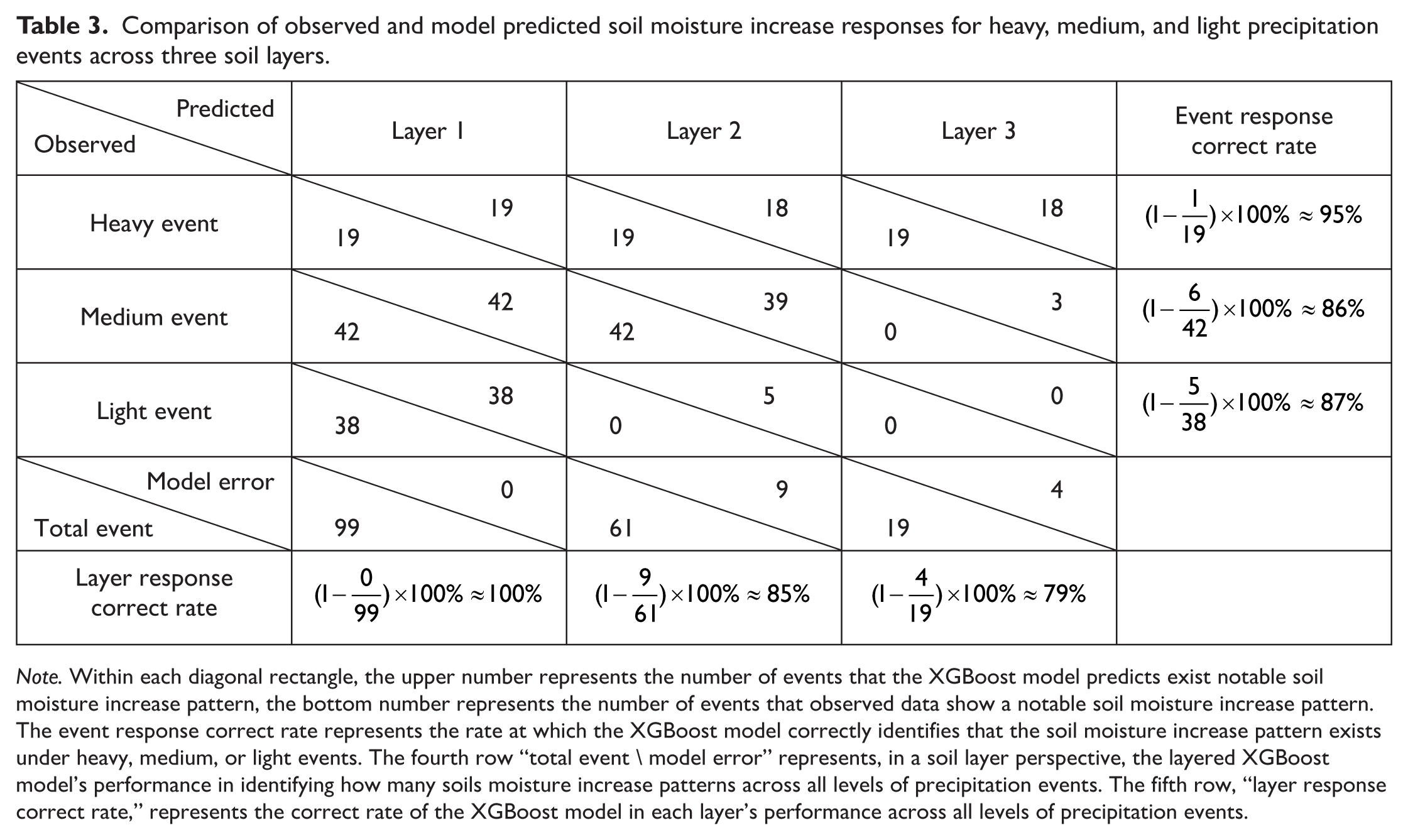 Based on events (horizontally), interlayer responses in 18 out of 19 heavy precipitation events are accurately modeled, yielding a 95% accuracy rate. In medium precipitation events, 6 out of 42 events were misclassified, resulting in an 86% accuracy. In light precipitation events, the accuracy drops slightly to 87%, with 5 out of 38 events showing unintended moisture increases in layer 2.