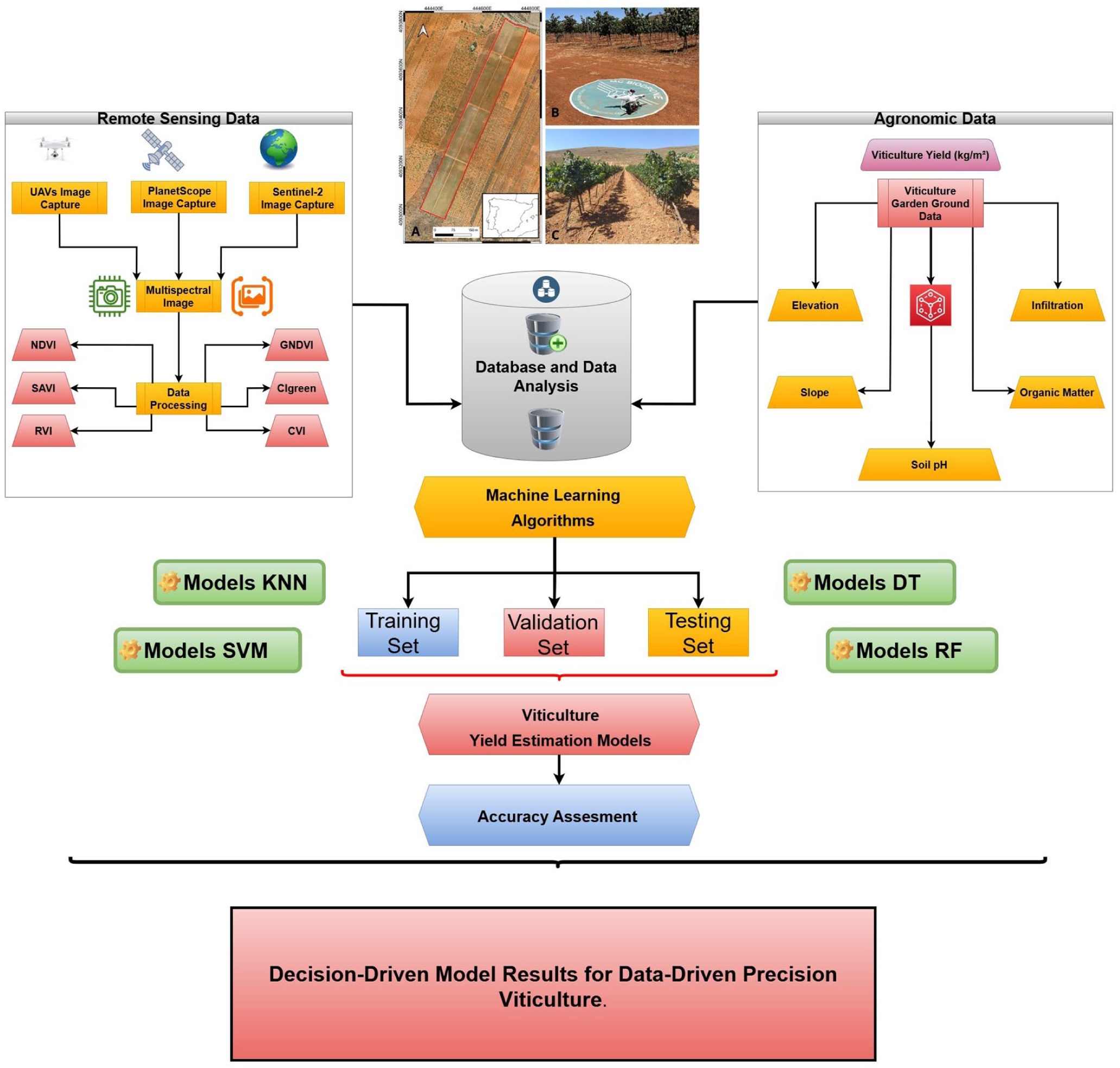Accordingly, the main objective is to develop and validate this integrated methodology. The research was conducted in a 9.2 ha experimental vineyard in Villamena, Granada (Spain), previously managed under conventional practices. Since mid-2022, high-resolution multispectral imagery (1–3 cm2) has been acquired using UAVs, alongside multi-temporal data from Sentinel-2 and PlanetScope satellites. Vegetation indices and soil variables were analyzed using advanced ML models—K-Nearest Neighbors, Support Vector Machines, Decision Trees, and Random Forests—to identify key patterns influencing vine vigor and yield (Adar, 2024; Beriain, 2023; Dias et al., 2024; Fahim & Sužiedelytė Visockienė, 2023; Pacheco et al., 2025). We hypothesize that (1) high-resolution imagery significantly improves yield prediction accuracy compared to lower-resolution sources, and (2) ML models trained on integrated vegetation and soil datasets outperform traditional approaches in capturing spatial variability. This methodology is intended to serve as a reference framework for researchers and practitioners seeking to implement efficient, sustainable, and data-driven precision agriculture solutions.