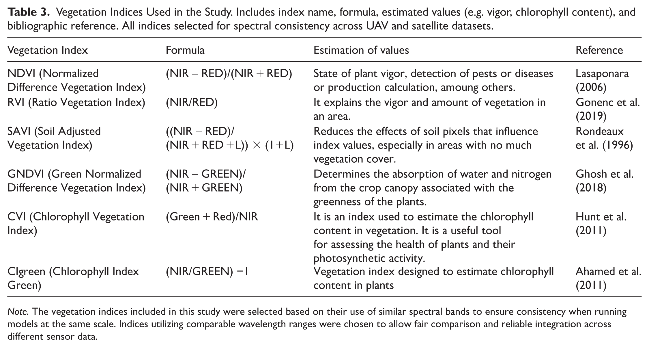 Vegetation Indices Used in the Study. Includes index name, formula, estimated values (e.g. vigor, chlorophyll content), and bibliographic reference. All indices selected for spectral consistency across UAV and satellite datasets.