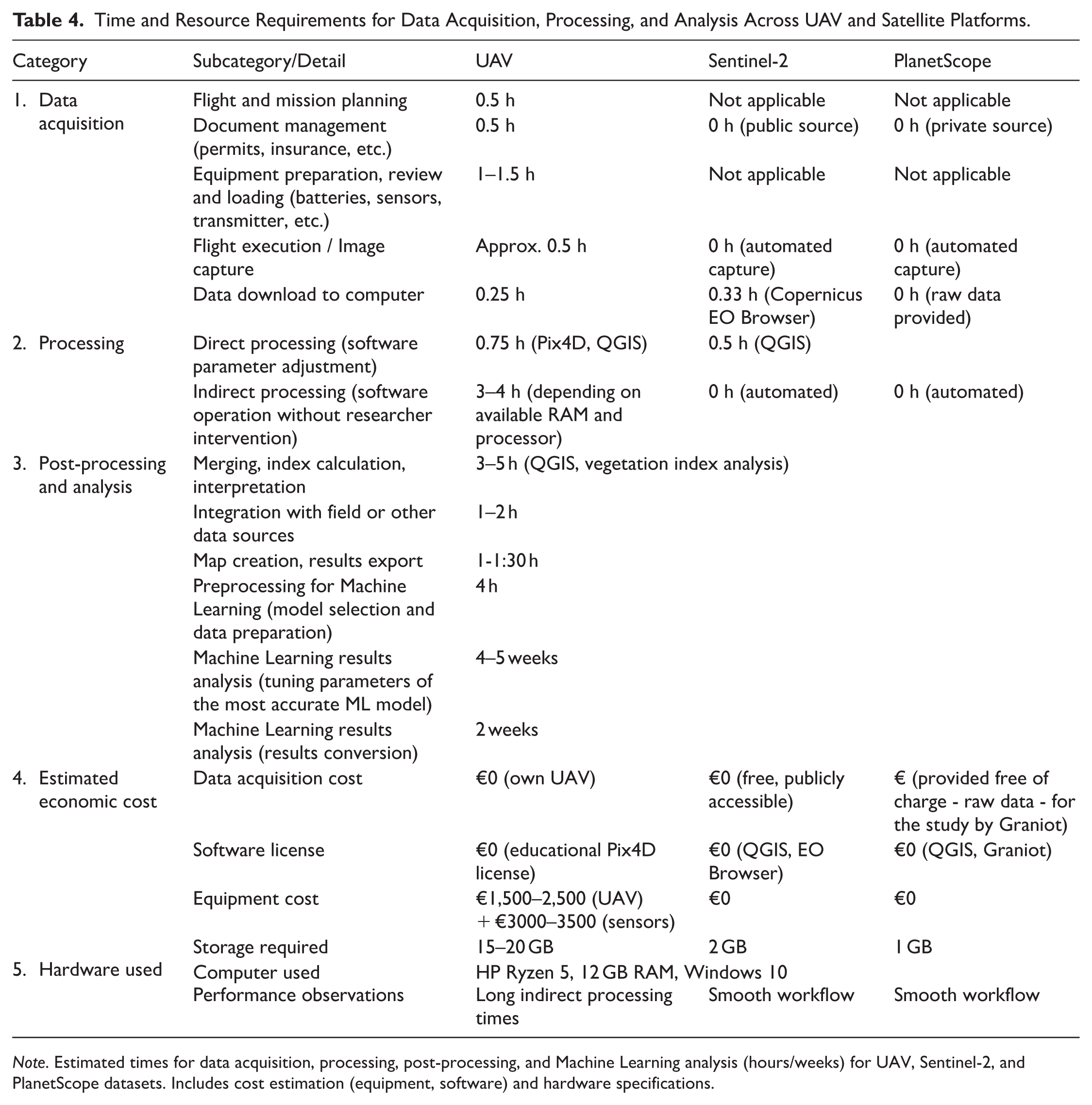 Time and Resource Requirements for Data Acquisition, Processing, and Analysis Across UAV and Satellite Platforms.