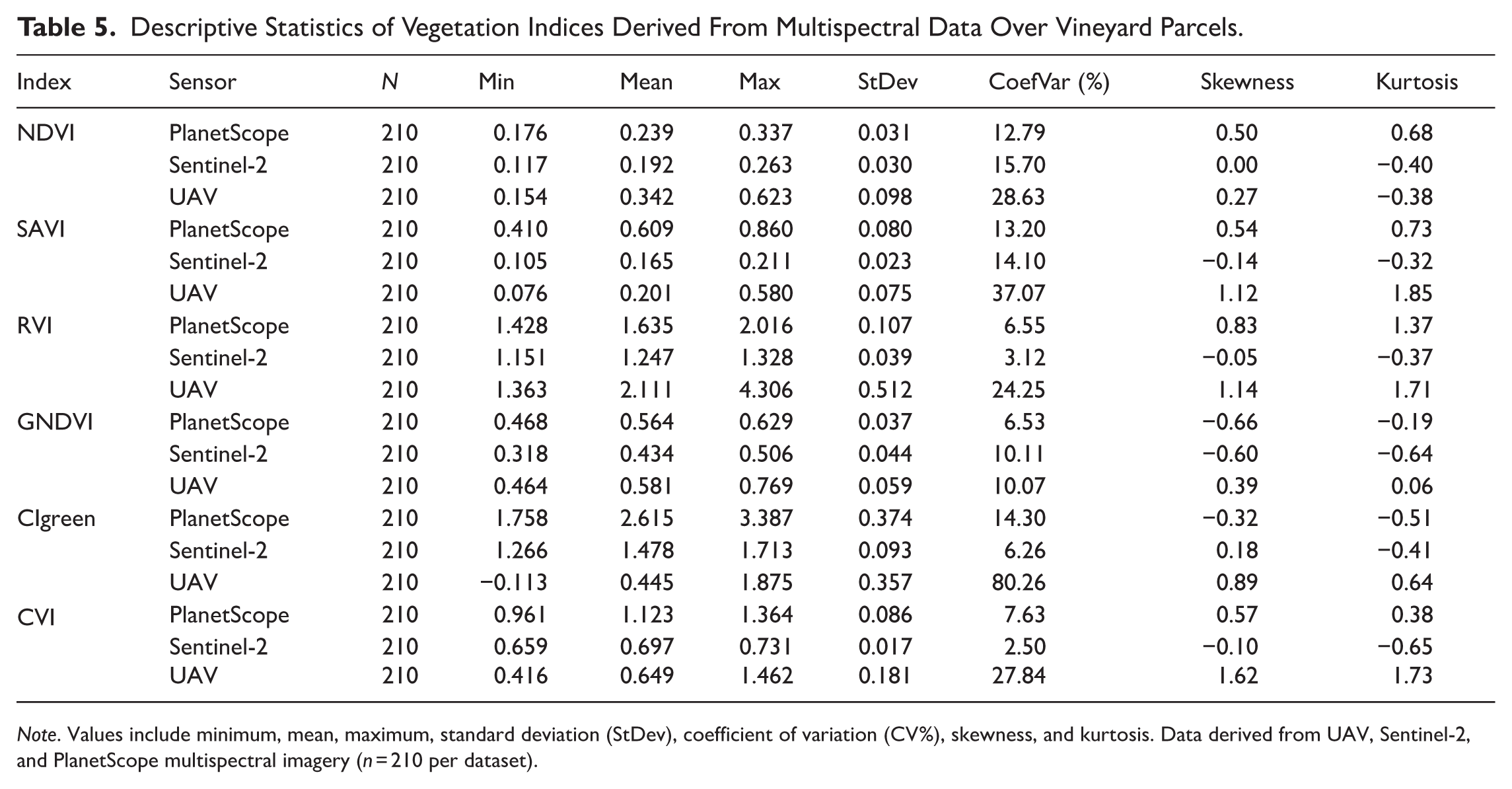 The results highlight clear and logical differences between UAV, PlanetScope, and Sentinel-2 imagery, primarily driven by sensor spatial resolution. UAV-derived data exhibited the highest coefficients of variation (CV%), particularly for SAVI and CVI, confirming their superior ability to capture fine-scale spatial variability within the vineyard. This pattern (UAV CV% > Sentinel-2 CV%) is consistent with previous findings showing that Sentinel-2 imagery tends to underestimate canopy heterogeneity due to its coarser 10 m pixel size (Khaliq et al., 2019).