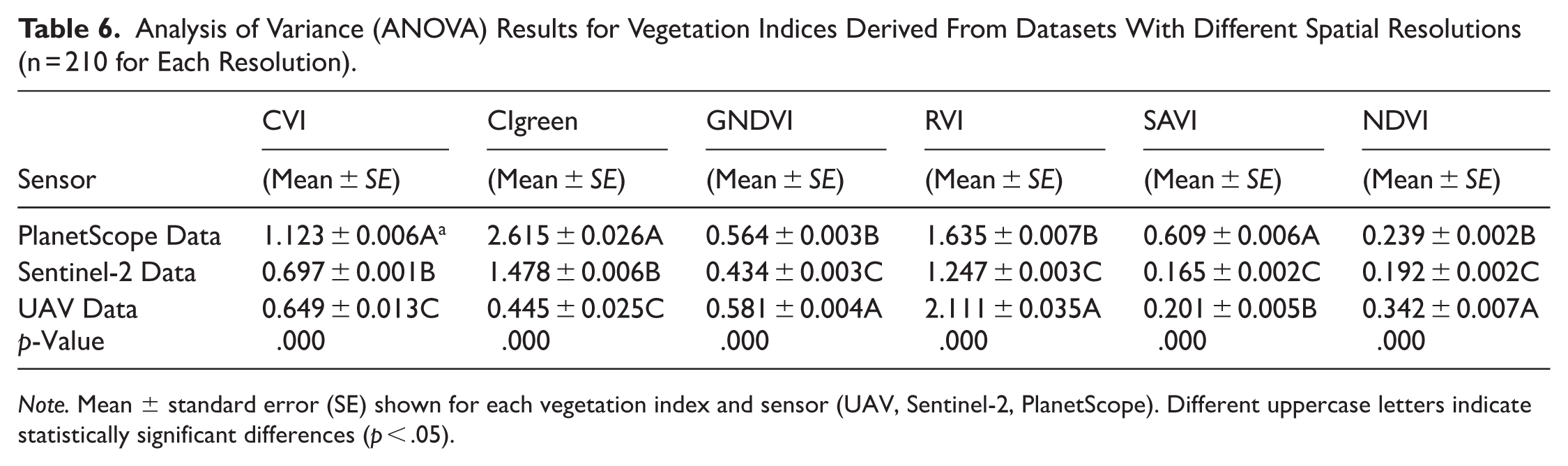 Analysis of Variance (ANOVA) Results for Vegetation Indices Derived From Datasets With Different Spatial Resolutions (n = 210 for Each Resolution).