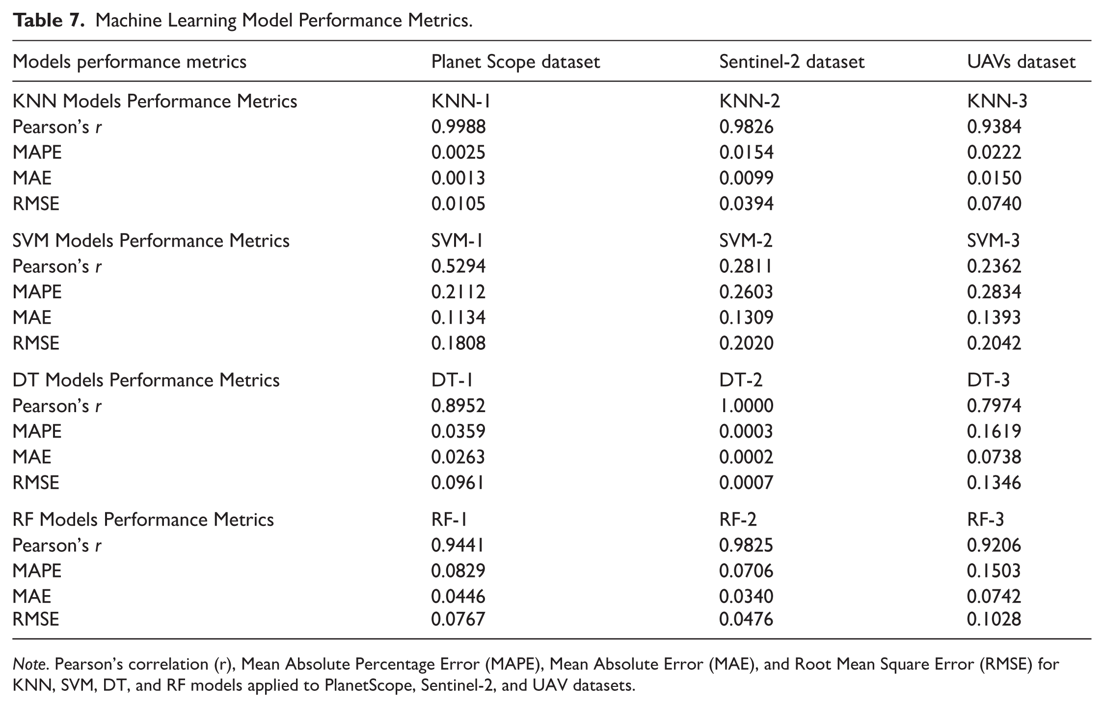 Regarding the evaluation of the machine learning models, the results indicate that the K-Nearest Neighbors (KNN) algorithm outperformed the other approaches across all datasets. Specifically, KNN achieved the highest accuracy when applied to PlanetScope imagery (