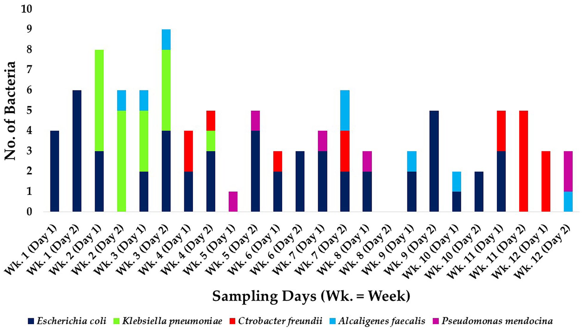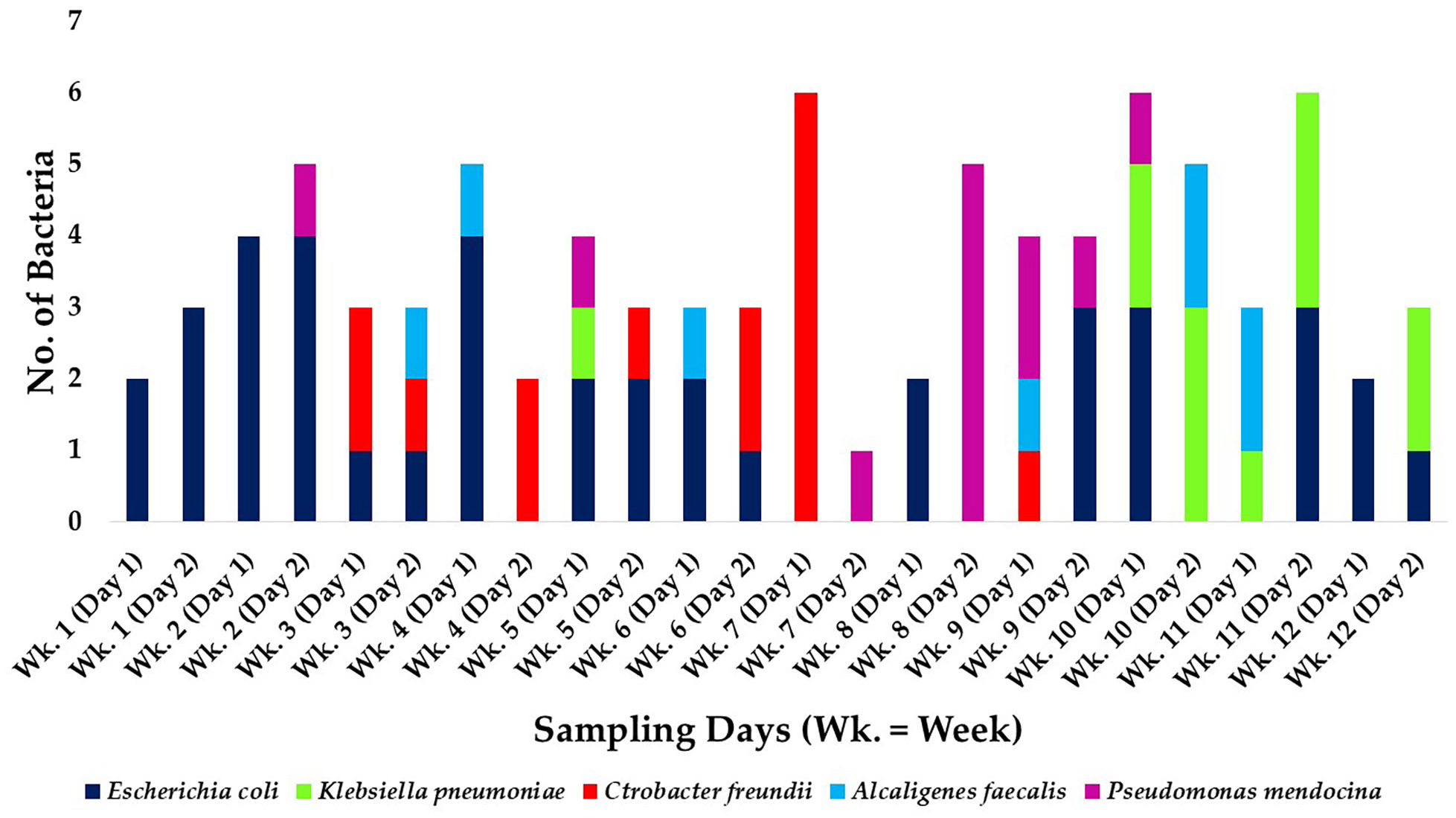 Spatio-temporal distribution of the predominant bacteria isolated from the hospital wastewater samples across the 12 weeks of sampling
