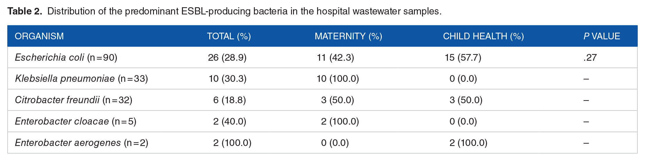 The wastewater generated by the Maternity and Child Health Units of KBTH harbored a wide range of multidrug resistant bacteria, with a good proportion of these being ESBL producers, and the predominant one being