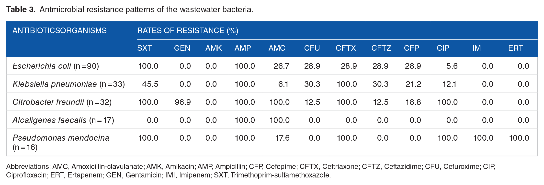 Antmicrobial resistance patterns of the wastewater bacteria.