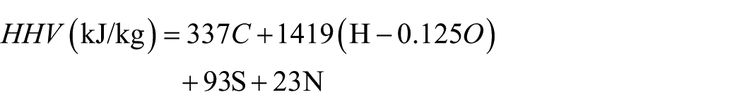In the equation, C, H, O, N, and S stand for the elemental percentages of carbon (44.04%), hydrogen (5.11%), oxygen (41.72%), nitrogen (1.53%), and sulfur (0.22%) in solid waste.