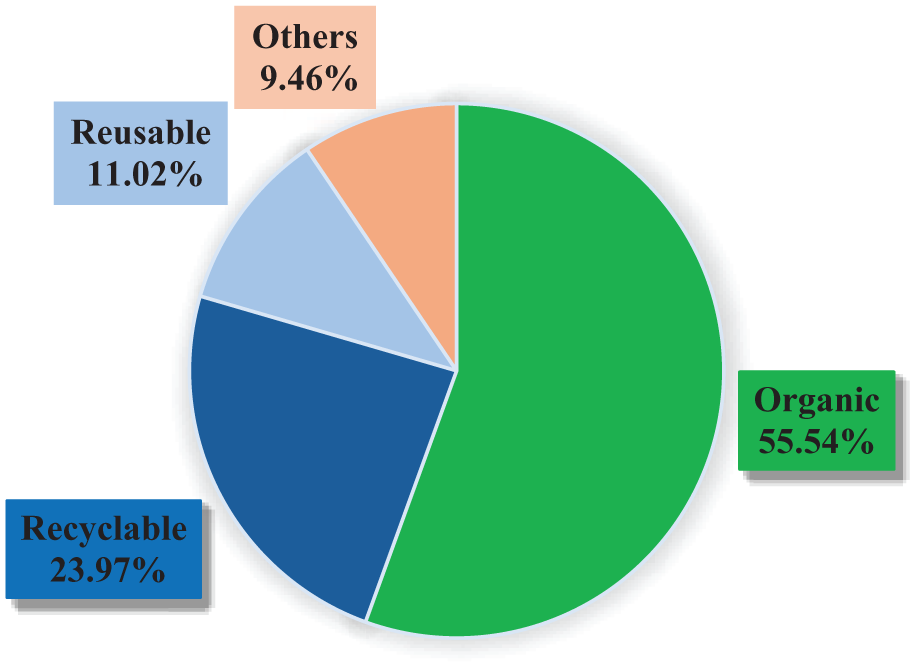 The results indicate that household solid waste composition is highly dominated by organic components, accounting for 55.5% of the total (Figure 1).