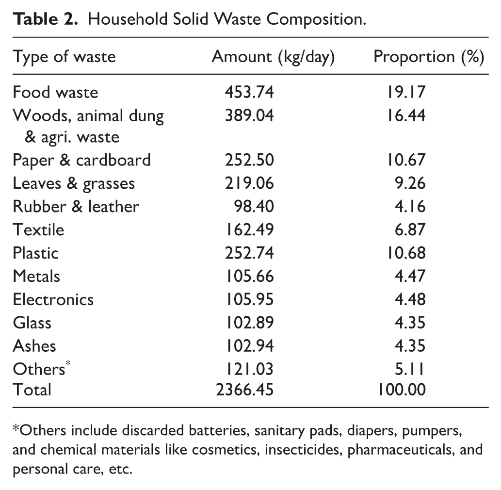The household’s solid waste composition result is presented in Table 2. As shown in the table, food waste constitutes 19.17% followed by wood, animal dung, and agricultural residue, accounting for 16.44% (Table 2).