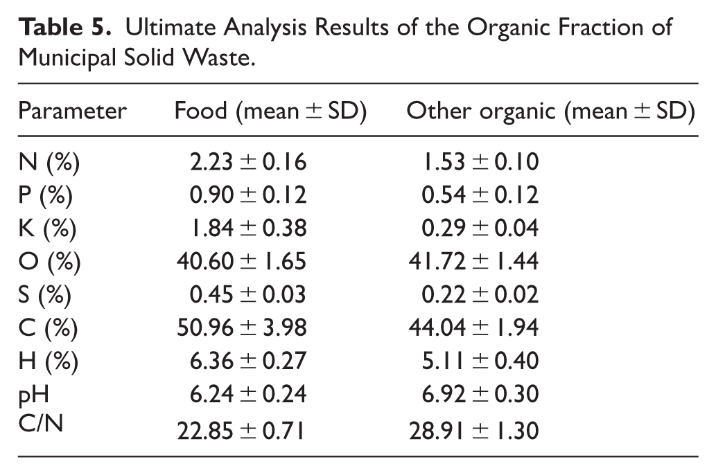 The elemental composition of the waste result is presented in Table 5, indicating that food waste contains the largest proportion of essential nutrients, compared to other organic waste products.