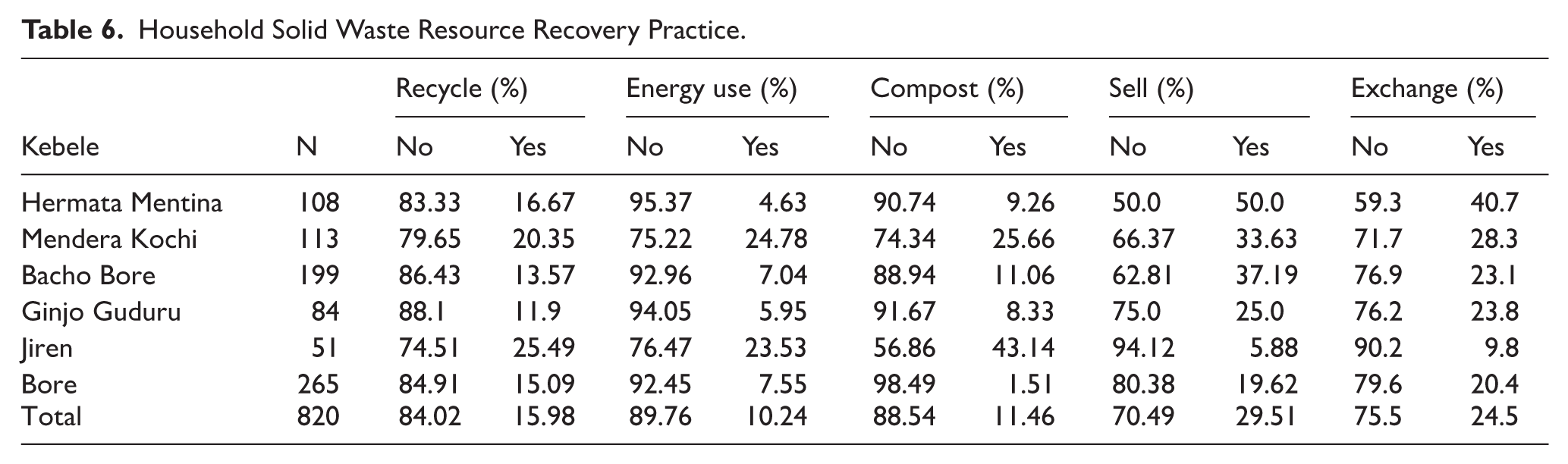 Household solid waste recovery practices mean transforming solid waste toward productive use through engagements such as recycling, utilizing waste for energy purposes, composting, and the retrieval of income through selling and exchanging discarded materials. In the study area, the actual levels of engagement in solid waste resource recovery are generally very limited, with selling being the most common practice, and energy recovery being the least.