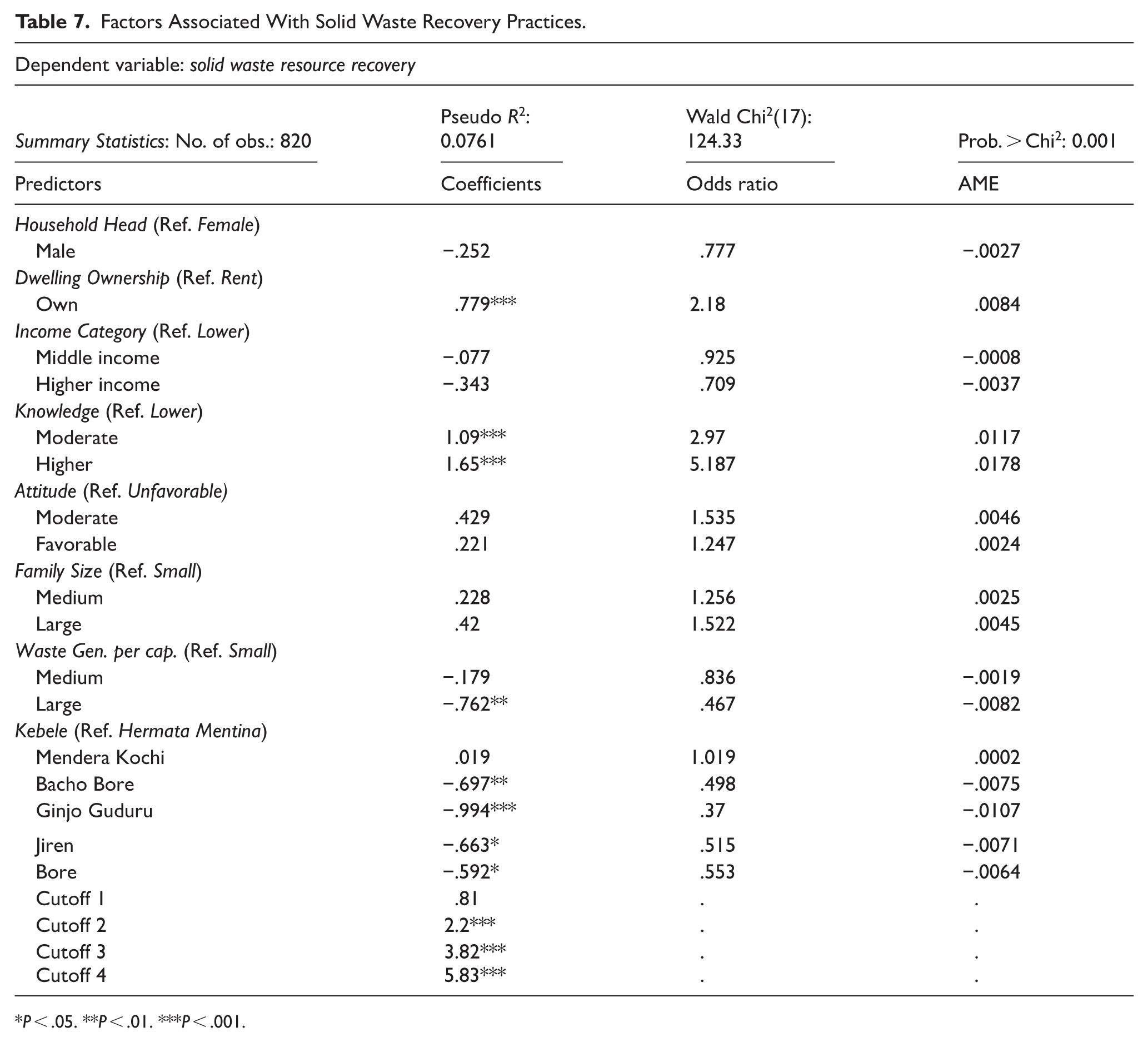 Furthermore, the researchers have performed ordinal logistic regression (OLR) to identify determinants of solid waste recovery practices among the households, consistent with previous studies by. 32 In the same manner, Kayamo utilized the OLR model to assess willingness-to-pay for improved SWM in Hawassa, Ethiopia. 33 Therefore, this study employed OLR or cumulative logit, after testing model fitness and fulfilling the standard proportional-odds assumption for the dependent variable. 34 OLR is a fitting model as it readily accommodates the mix of different variables, allowing dummy (indicator) variables for nominal factors and other ordinal covariates, while returning interpretable odds ratios. 35 However, cluster-adjusted standard errors were implemented in the OLR model to account for the nested data structure and ensure valid statistical inference; the details were in the Supplemental File 1. The results are presented alongside odds ratios (OR) and average marginal effects (AMEs) to improve the interpretability of regression outcomes.