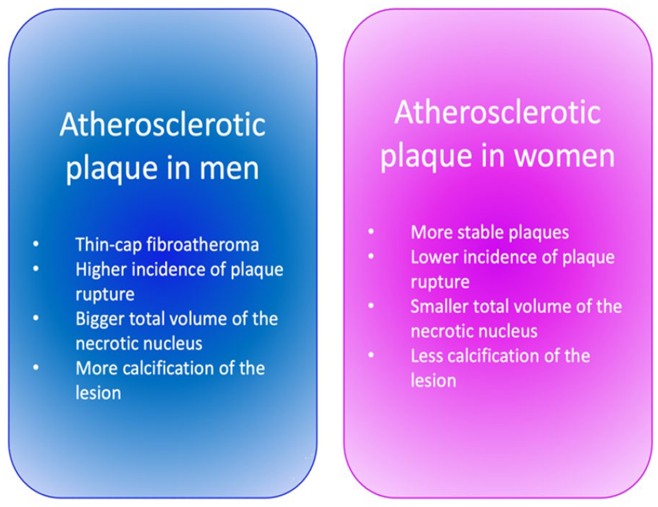 Studies conducted among people have shown that women often have less stress on atherosclerotic plaques and fewer signs of high-risk plaques in contrast to men. As a rule, this remains genuine even in the context of clinical events, both in active lesions and non-culprit lesions. 60 Since most studies were conducted on young individuals and middle-aged individuals, there is still a question about whether the presence of plaques or their morphology promotes the mechanism of catching up with the increase in the number of cases in older women.