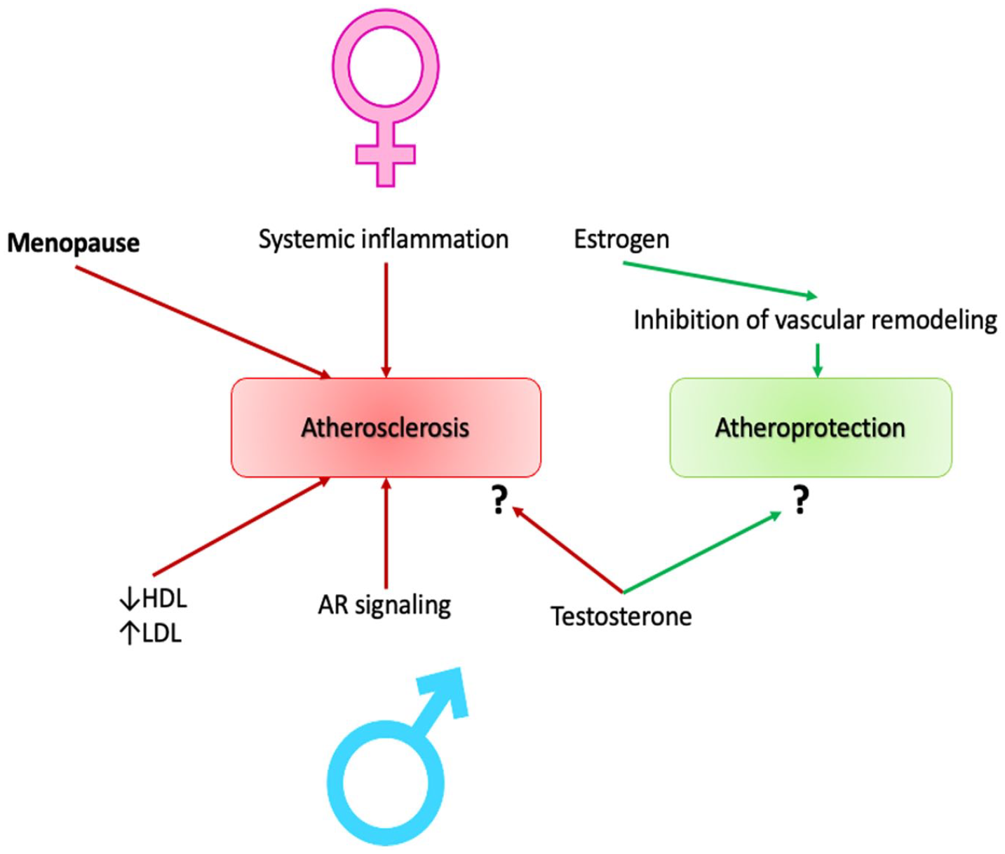 We summarized the mechanisms of sex-associated differences in Figure 3. While the atheroprotective effect of testosterone, as well as atherogenic effect, remains questionable, the strong evidence of estrogen implication on the vascular remodeling inhibition, and thus, in atheroprotection, was provided. However, the female sex is also associated with higher incidence of systemic inflammation, which contributes to atherogenesis. Another association of female-specific factor with atherosclerosis, is menopause, which is also typically linked to aging. As for male sex, there are more systemic mechanisms associated with atherosclerosis, such as altered lipid profile, and androgen receptor signaling.