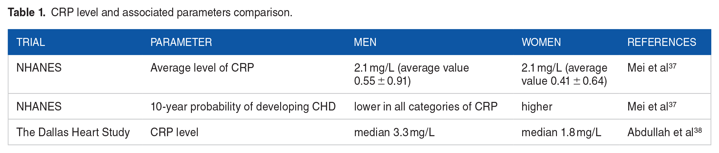 Systemic inflammation in human beings could be assessed by measuring blood-based biomarkers; the inflammation of plaques can be evaluated using arterial wall imaging. CRP is a key sign of systemic inflammation and a harbinger of cardiovascular disease. 36 We represent the data in Table 1. When assessing the NHANES survey, the average level of CRP (2.1 mg/L) was similar for both sexes, but the average value for women (0.55 ± 0.91) was higher than for men (0.41 ± 0.64). In this study, despite higher levels of CRP, women had a lower 10-year likelihood of developing coronary heart disease (CHD) in all categories of CRP. 37 The Dallas Heart Study confirmed these outcomes through a cross-sectional analysis of more than 2700 patients aged 30 to 65 years, the results demonstrated that women had higher CRP levels (median 3.31 mg/L) than men (median 1.8 mg/L). 38 In the GSMS study, children aged 9 to 13 were followed up to the age of 21. Changes in CRP in boys and girls began to diverge around puberty (approximately 15 years old), when the growth rate of the CRP became faster in girls CRP, in contrast to a smaller linear growth in boys. 39 It is noteworthy that the use of oral HRT was also linked with an increased level of CRP. In postmenopausal women, the level of CRP is the same as in men, but any type of HRT (progesterone with or without estrogen) increases the level of CRP. However, one possible explanation is that estrogen elevates CRP by affecting protein synthesis in the liver, other systemic inflammation markers (including IL-6, IL-1β, and TNFa) are also elevated by estrogen. Female sex hormones can provoke systemic inflammation; there are other factors that may also weaken the vascular effects of increased systemic inflammation among women. 40