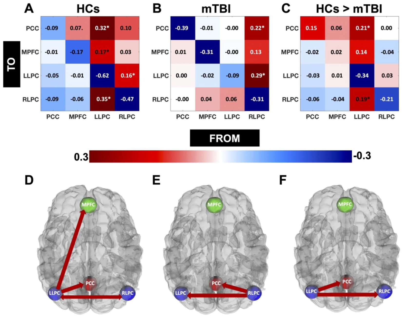 EC for HCs and individuals with mTBI. Here we showed the subject average EC strength (in Hz) of all the connections within the DMN for HCs (A) and post mTBI (B). Positive and negative values here represent the exhibitory and inhibitory connections respectively. In Figure 1C, we showed the comparisons of EC strengths between HCs and post mTBI. The positive values here represent the connections that are stronger in HCs than post mTBI, whereas the negative values here represent the connections that are weaker in HCs than post mTBI. Connections exceeding the Pp of 95% are indicated by “*” in Figure 1(A to C), and are shown in Figure 1D (HCs), 1E (mTBI), and 1F (HCs > mTBI).