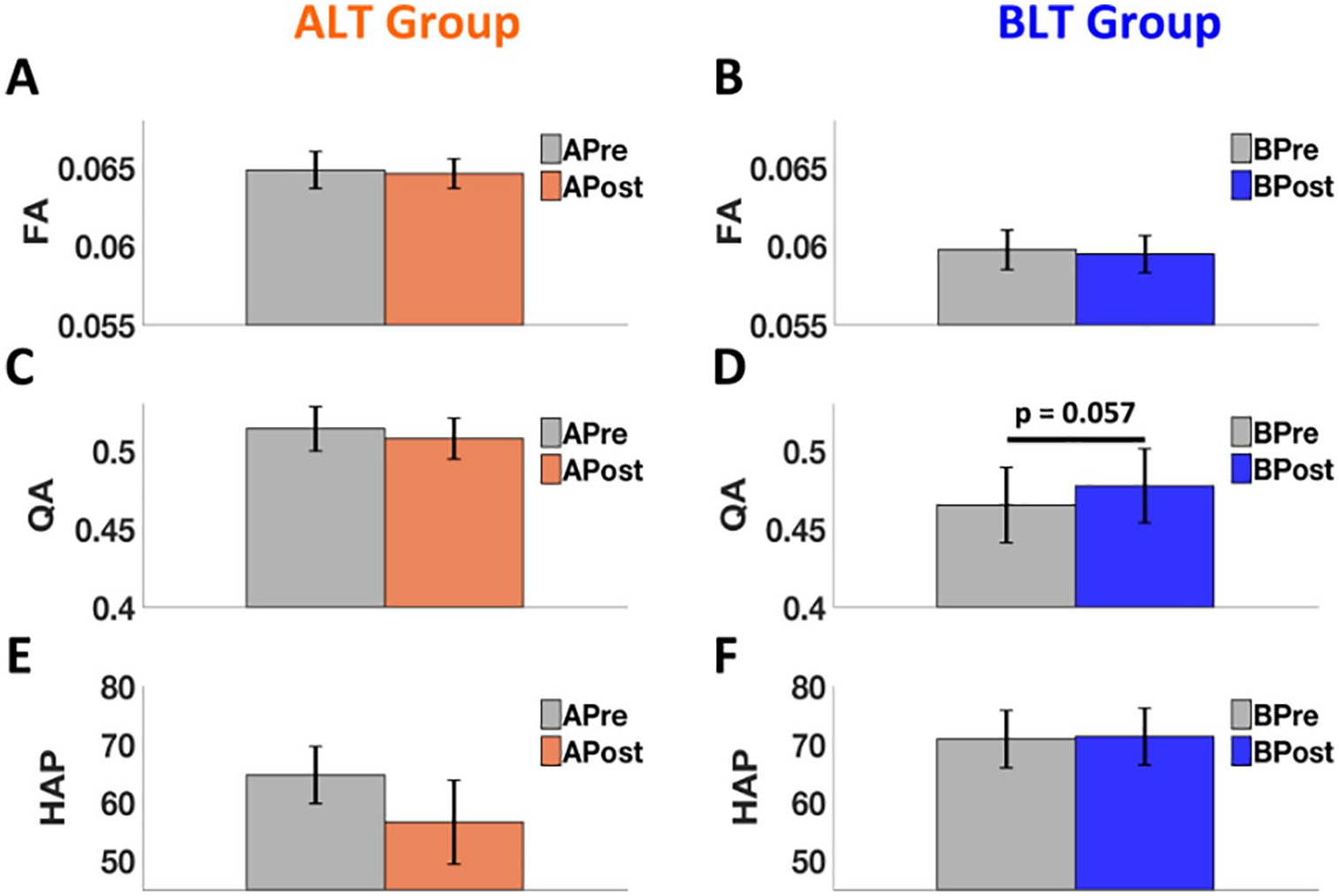 Comparisons of FA, QA, and levels of happiness (HAP). We found that there was no significant difference in FA for tracts connecting LLPC and MPFC for either ALT group (APre vs APost) (paired