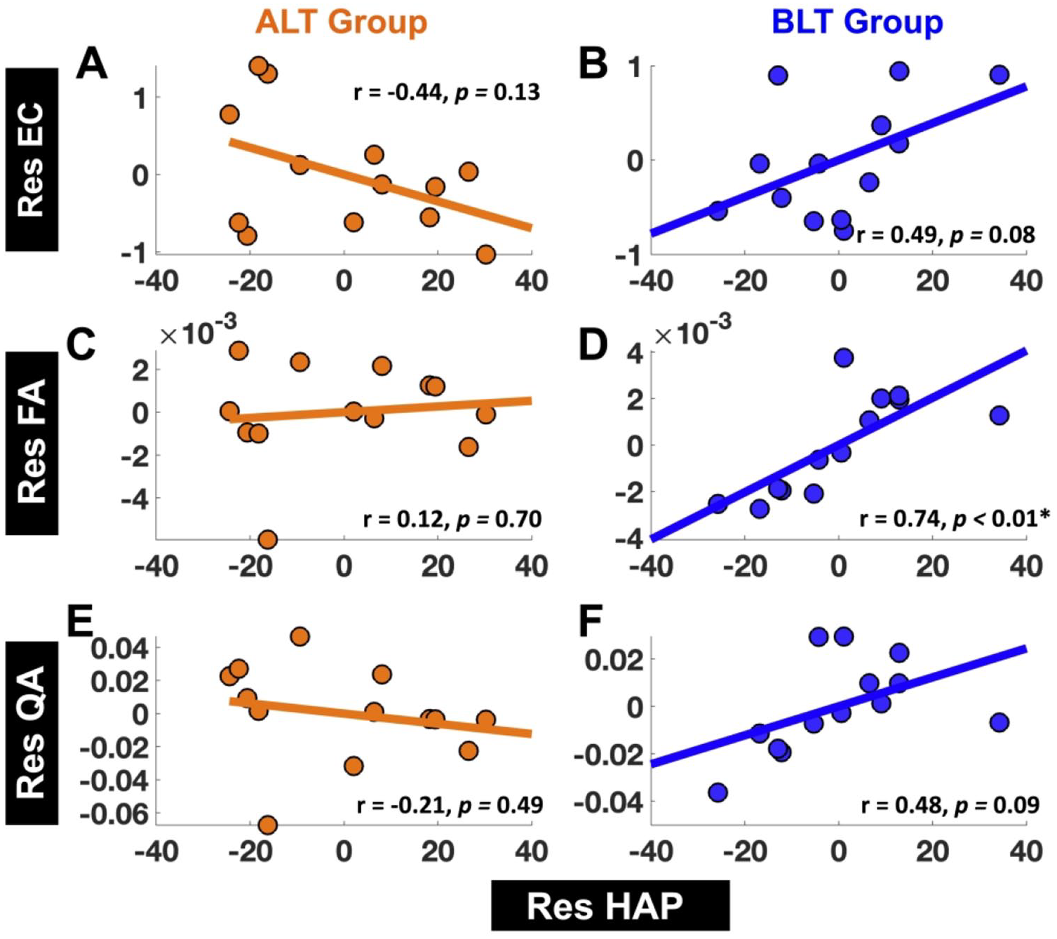 Associations between residualized changes (pre- to post-treatment) in happiness (Res HAP) versus residualized changes (pre-to post-treatment) in EC (Res EC), FA (Res FA), and QA (Res QA). We did not find significant association between residualized changes in happiness scores (Res HAP) and residualized changes in EC (Res EC) from LLPC to MPFC for ALT group (A), but there was a clear tend showing a positive association between Res HAP and Res EC from LLPC to MPFC for BLT group (B). There was no significant association between Res HAP and Res FA for tracts connecting LLPC and MPFC for ALT group (C), but there was significant positive association between Res HAP and Res FA for tracts connecting LLPC and MPFC for BLT group (D). Lastly, there was no significant association between Res HAP and Res QA for tracts connecting LLPC and MPFC for ALT group (E), but there was a clear trend showing a positive association between Res HAP and Res QA for tracts connecting LLPC and MPFC for BLT group (F).