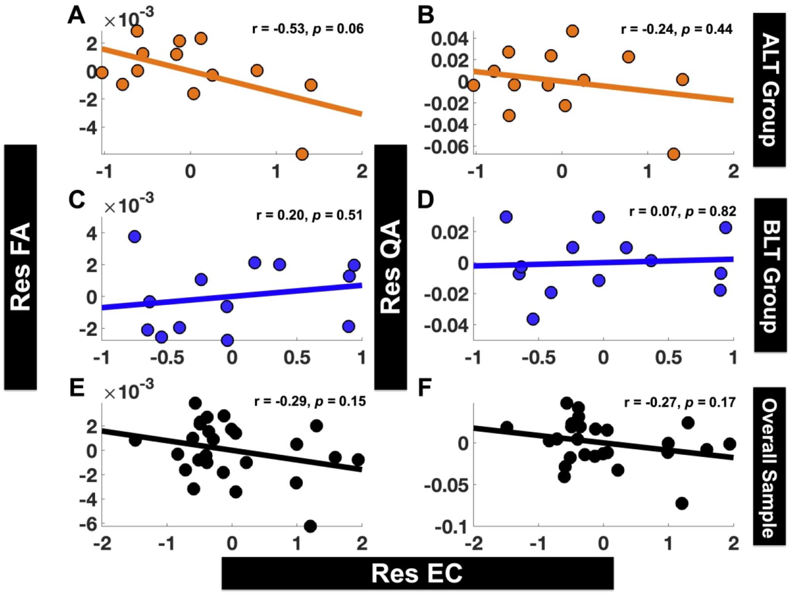 Associations between residualized changes (post- to pre-treatment) in EC (Res EC) versus residualized changes (post- to pre-treatment) in FA (Res FA) and QA (Res QA). Neither of the groups ALT (A and B) or BLT (C and D) showed significant association between Res EC from LLPC to MPFC and Res FA (A, C) or Res QA (B, D) for tracts connecting LLPC and MPFC. Overall sample also did not show significant association between Res EC from LLPC to MPFC and either Res FA (E) or Res QA (F) for tracts connecting LLPC and MPFC.