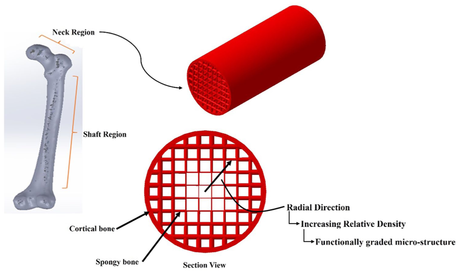 The spongy tissue that forms the inner layer of long bones has more pores in its central region. In the femoral neck region, by moving from the central axis of the bone shaft to its outermost layer radially, the level of porosity decreases, which causes a gradual change in the mechanical properties of the spongy tissue.45 -47 In recent research works, cellular materials composed of repeating unit cells have gained significant interest as potential biomimetic structures for bone tissue. These studies have primarily focused on identifying the most suitable lattice configurations that closely replicate the compressive mechanical behavior of natural bone. Various unit cell geometries have been examined to model trabecular bone, and their effective mechanical properties have been evaluated against actual bone tissue. Moreover, different unit cell dimensions have been analyzed to assess how cell morphology influences mechanical performance, and the optimal strut diameter for each unit cell design has been determined.48 -51