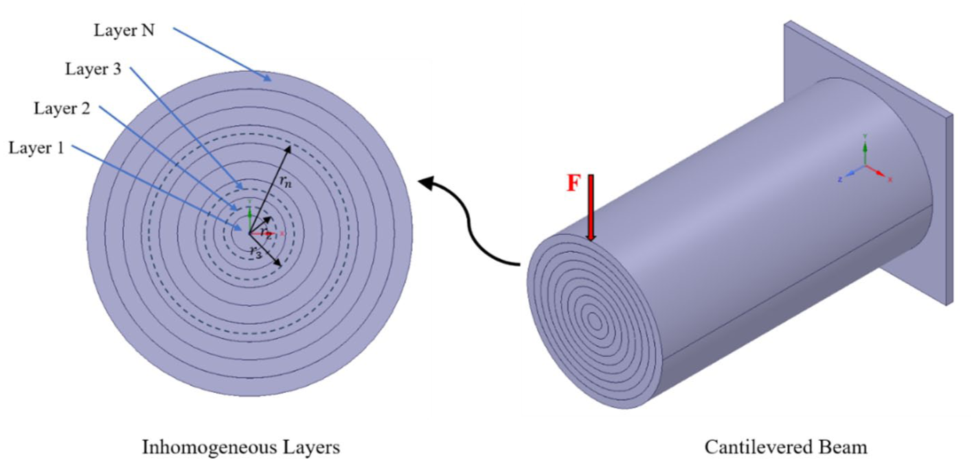 ANSYS R2019 package was used for finite element (FE) modeling. According to the flowchart shown in Supplemental Material Figure S3, a multi-layered cantilevered beam was considered for linear analysis. The layers were bonded to each other, and the load was applied transversely to the bone section. For the 8 different types of unit cells, separate models were prepared and the average Young’s modulus for the bone cross-section was investigated numerically. The cylindrical models were discretized using 3D hex element type and they were finally subjected to concentrated quasi-static loading. The deflection of the beam was extracted, and the average Young’s modulus for each unit cell was calculated using equation (1). To check the effect of the number of layers in the cylindrical geometry, models having 2, 5, 10, 15, and 20 layers were prepared and a convergence criterion was considered.