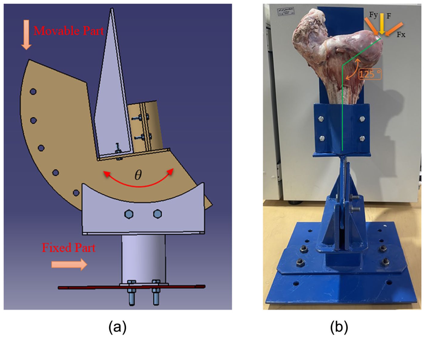The experimental test setup consisted of a rotating movable part and a fix part as shown in Figure 5a. The movable part was able to be rotated every 15°, allowing for performing the experiments at different angles. In this research, the load was applied vertically on the femur hemispherical end (Figure 5b) and displacement along bone shaft axis was measured.