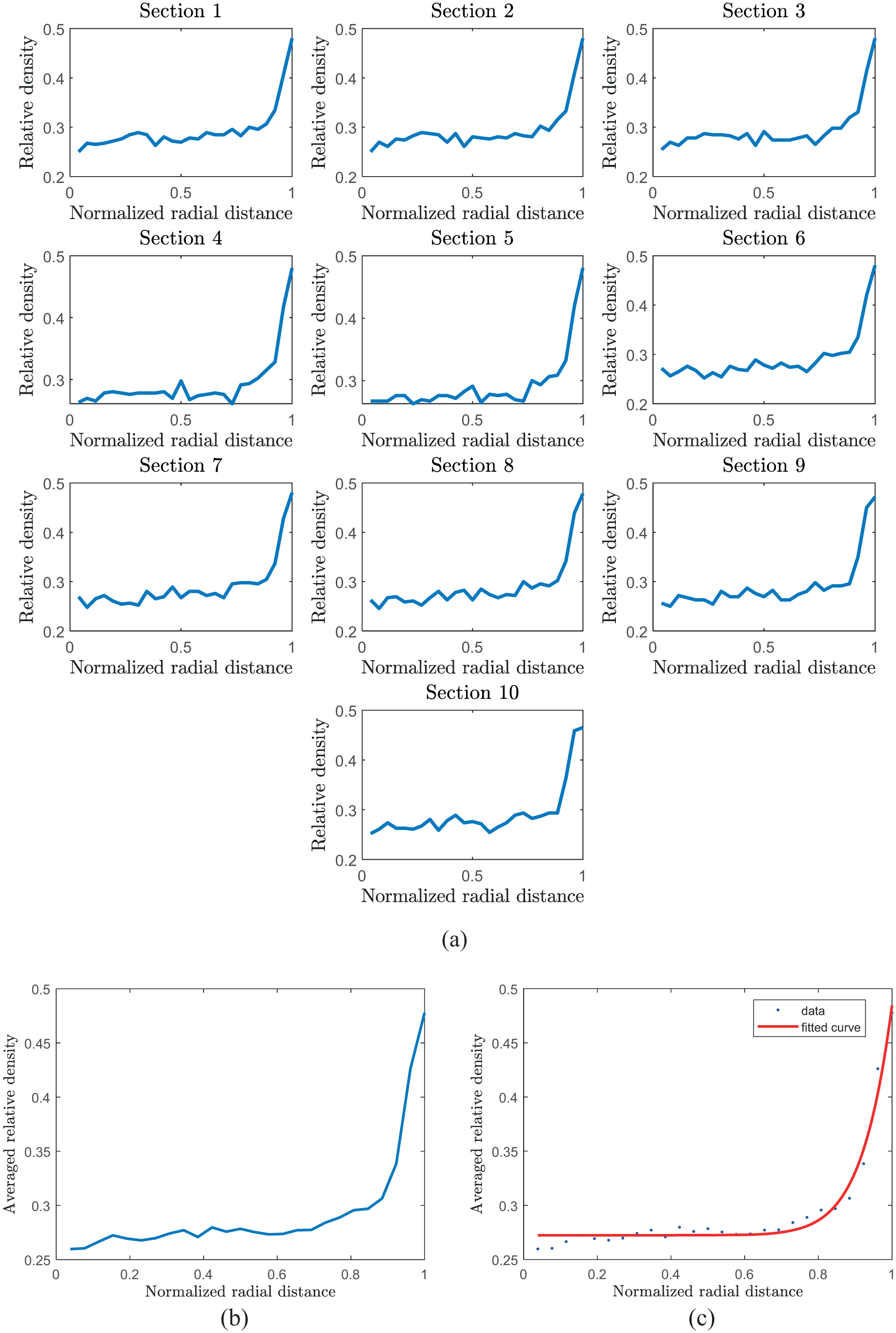 (a) The relative density changes versus normalized radial distance for 10 different considered sections, (b) the average density changes for all the spongy bone sections, and (c) power law curve fitting for average density versus normalized radial distance.