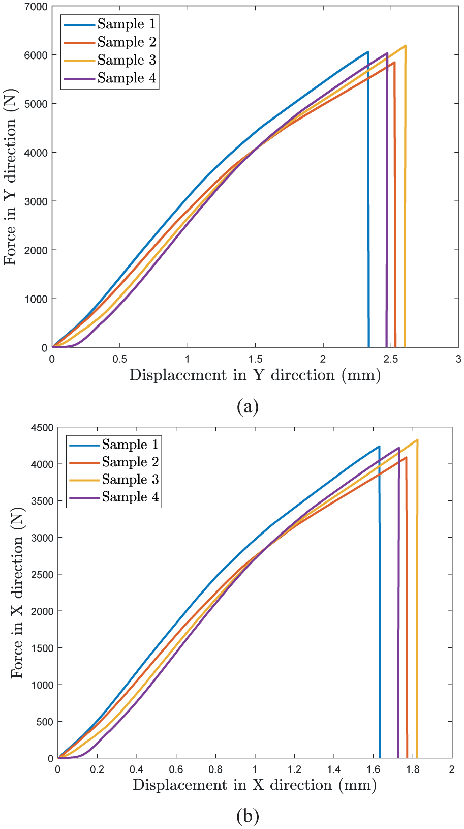 Femur neck bone force versus displacement curve for 4 samples in: (a) Y direction and (b) X direction.