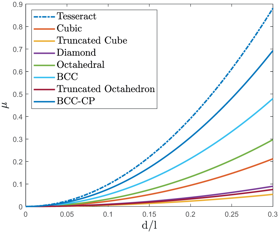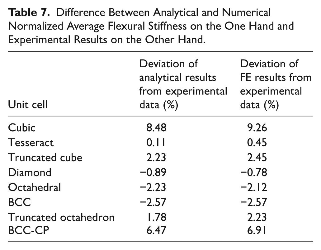 Deviation of analytical and FE results from experimental data have been calculated using results presented in Tables 5 and 6. Discrepancy between experimental on the one hand and analytical and numerical results on the other hand are presented in Table 7 (Negative values represent that the analytical/FE results have lower values than the experimental results). The Tesseract unit cell with a deviation of 0.11%, and the cubic unit cell with a deviation of 8.48% have the closest and furthest proximity to the experimental results, respectively.