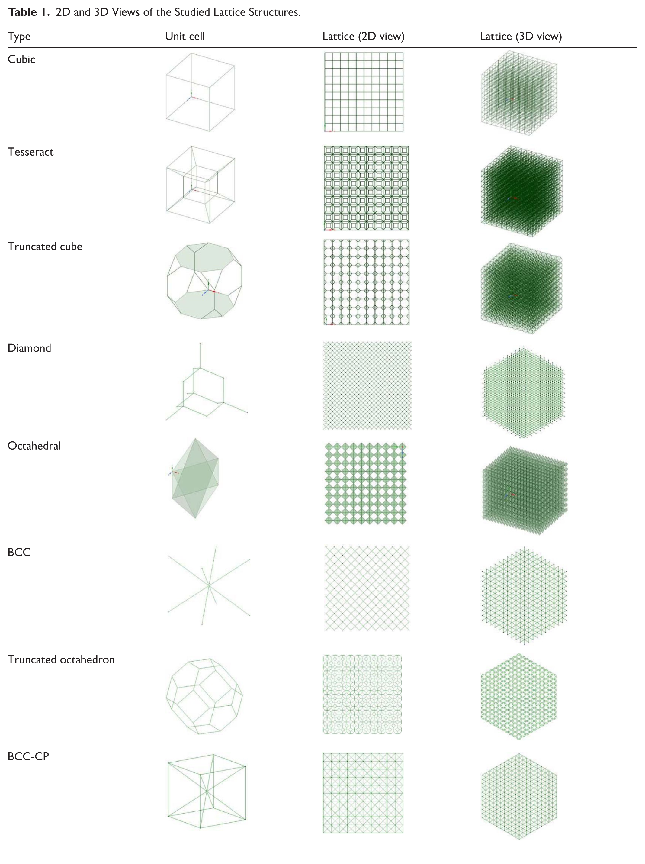 Spongy bone is a network of interconnected rods that are irregularly placed together. Regular lattice structures are one of the most promising candidates for modeling porous tissues such as spongy bone due to their simplicity, ease of interpretation, and ease of investigation of the effect of varying different geometrical and material properties on the mechanical response. Many unit cell types have been known to date, which can be used to make porous structures of bone tissue. Nonetheless, it should be noted that a rationally designed porous structure, in addition to the geometric constraints, must also be mechanically compatible with the bone tissue to avoid unwanted phenomena such as stress shielding. In the present study, 8 different unit cell geometries (Table 1) were selected because they have been widely reported in the literature as suitable representations for modeling trabecular and porous structures.49,52,58,59 The choice of these specific cells allowed us to systematically compare their performance within the functionally graded lattice framework while maintaining consistency with previous biomechanical modeling approaches.