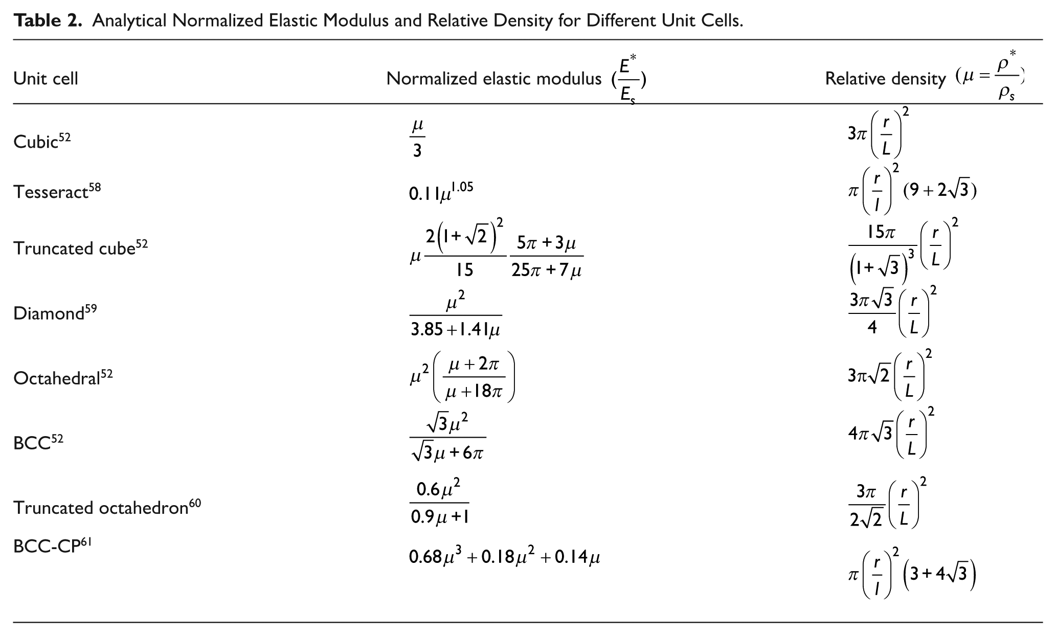 Analytical Normalized Elastic Modulus and Relative Density for Different Unit Cells.