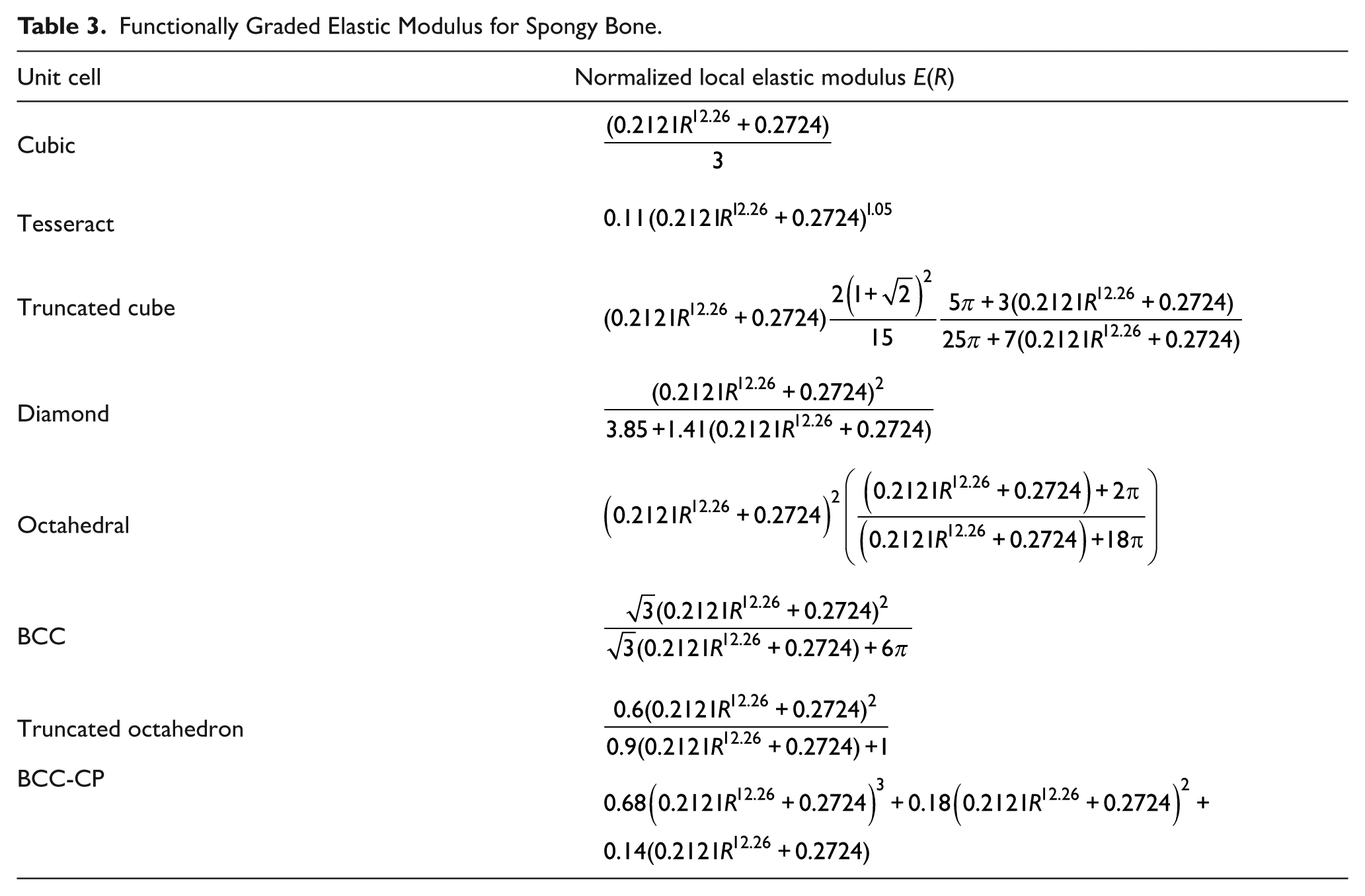 By considering spongy bone as an inhomogeneous material, and by using equation (8), Normalized local elastic modulus relationships as a function of normalized radial distance for spongy bone cross-section can be obtained and are listed in Table 3. For all unit cells, with increasing the radial distance, the density as Young’s modulus increases. For instance, Tesseract unit cell at