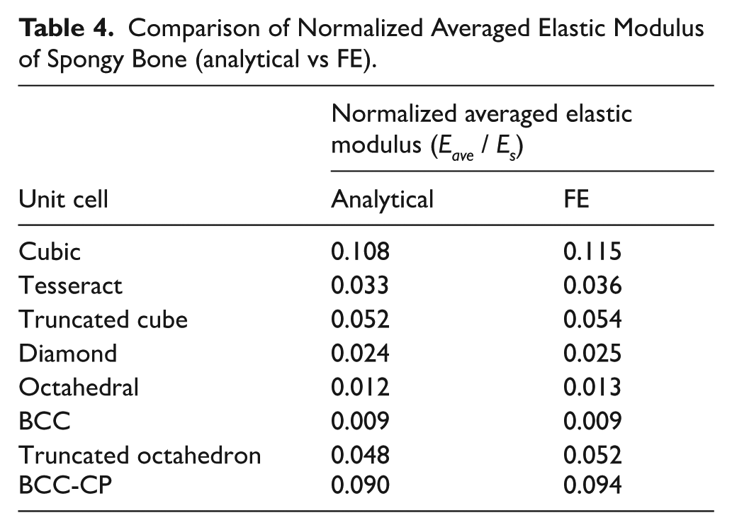 Table 4 compares the averaged elastic modulus obtained from analytical and finite element methods. In both approaches, the Cubic and BCC structures represent the maximum and minimum elastic modulus for spongy bone, respectively. According to Table 4, analytical approach in general gives lower values of elastic modulus compared to FE models.