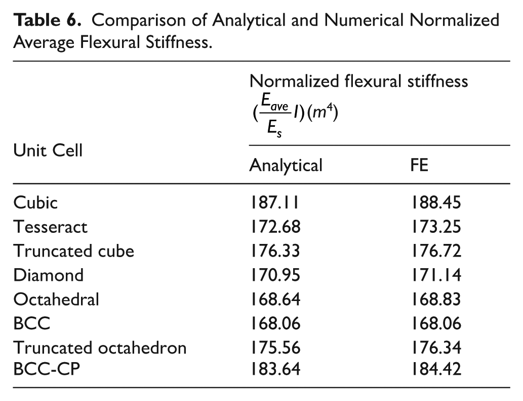 Analytical and numerical normalized average flexural stiffness values for different unit cells are presented and compared in Table 6. Cubic and BCC with