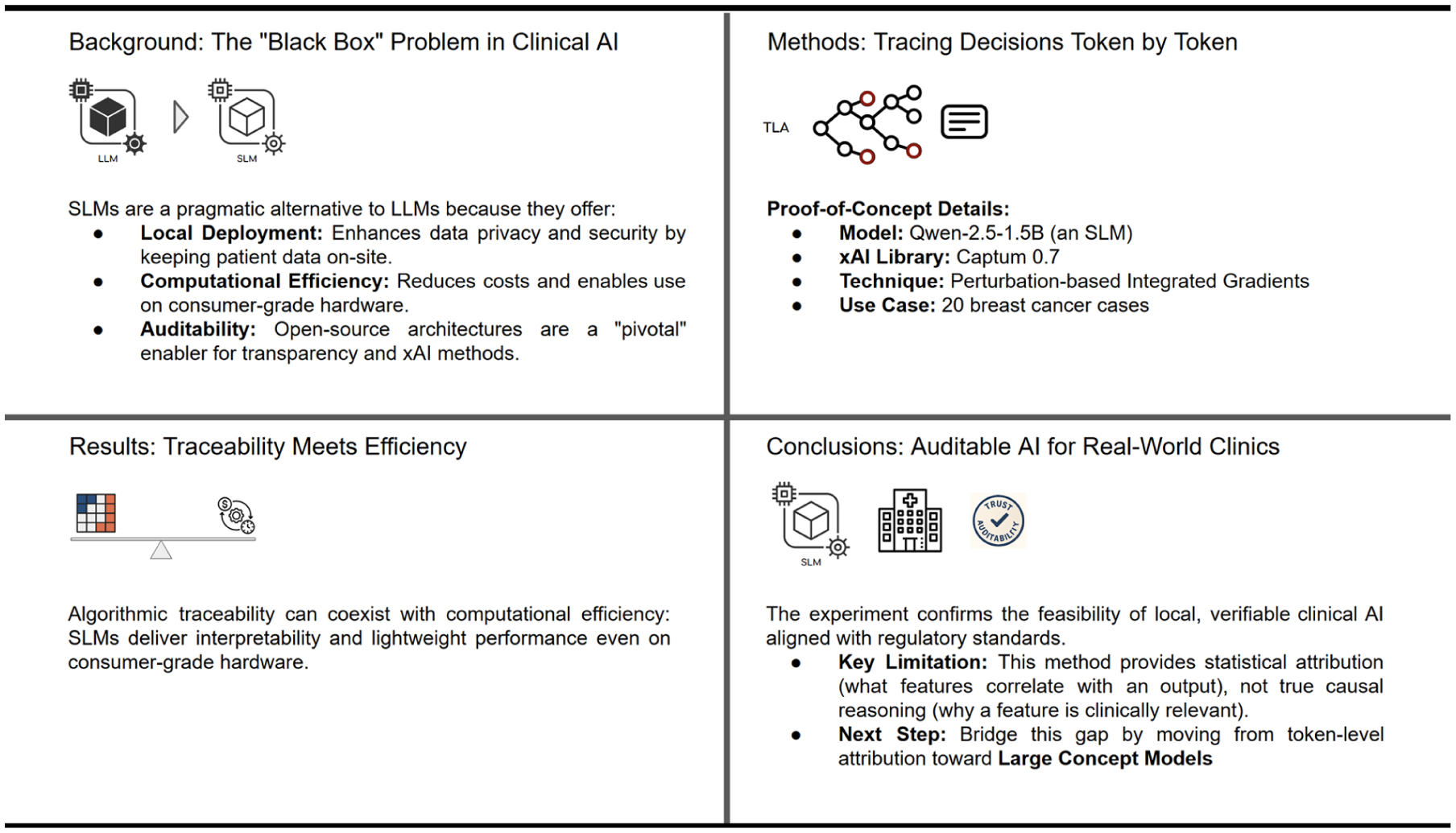 Widespread clinical adoption of language models remains hindered by regulatory demands for algorithmic traceability (eg, EU AI Act Article 13, FDA SaMD guidelines),3,5 which fundamentally conflicts with the opacity of current LLMs. This study tests whether SLMs with open weights, code for the model architecture,3,5 and modern xAI techniques can provide technical traceability within real-world clinical constraints (hardware, latency), 2 distinct from aiming for textual explainability.