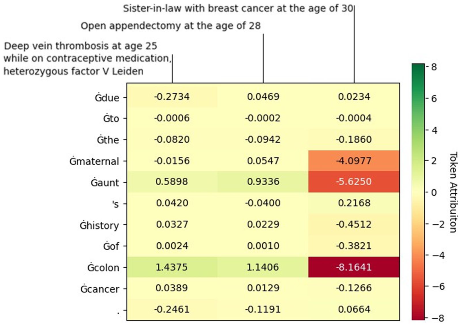 The result of the analysis with Captum mapped relationships between input text features and the generated tokens. By systematically varying text features, critical decision factors were identified and compared their importance across diverse clinical scenarios. This approach provided insights into the model’s reasoning processes and enabled us to refine its interpretability.