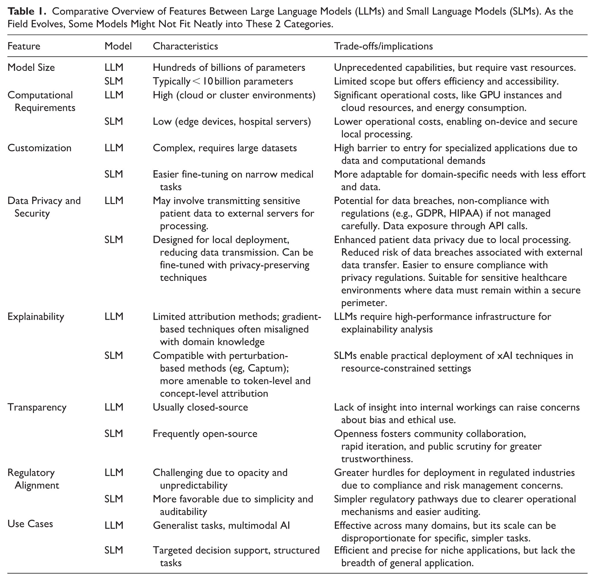 The evolution of language models in healthcare is undergoing a significant transformation. While LLMs continue to demonstrate impressive capabilities, 14 SLMs emerge as a complementary solution that effectively addresses the specific needs of the healthcare sector, particularly in terms of security, privacy, and regulatory compliance. 1 (S)LMs can be analyzed with the xAI lens when they are open-source, thus allowing for the weights and architecture to be inspected. 5 By focusing on what these models can achieve within limited computational environments, the concept of “small” is redirected in a way that emphasizes their transformative potential across a wide range of applications, and thus extends the application value continuum of language models. This shift toward SLMs offers a pragmatic balance among efficiency, interpretability, and practicality, crucial for widespread adoption (Table 1).