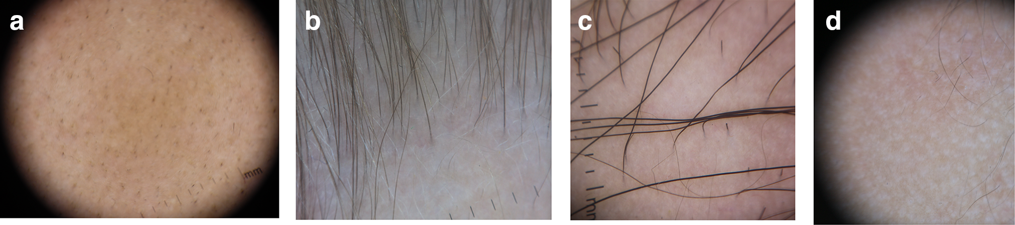 Dermoscopy Photos. a. Black dots. b. Vellus Hairs in a regrowing patch. c. Upright regrowing hairs (right half) with a few exclamation mark hairs (left half). d. Empty Hair Follicles