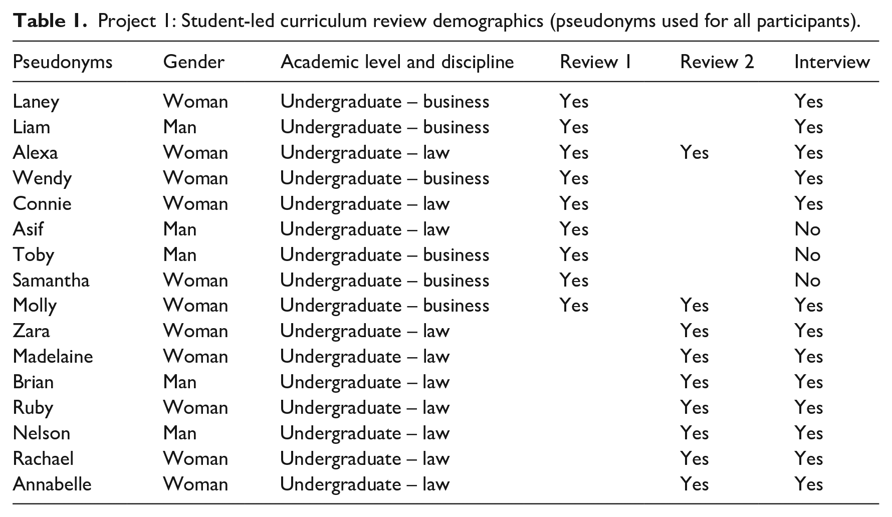 Project 1: Student-led curriculum review demographics (pseudonyms used for all participants).