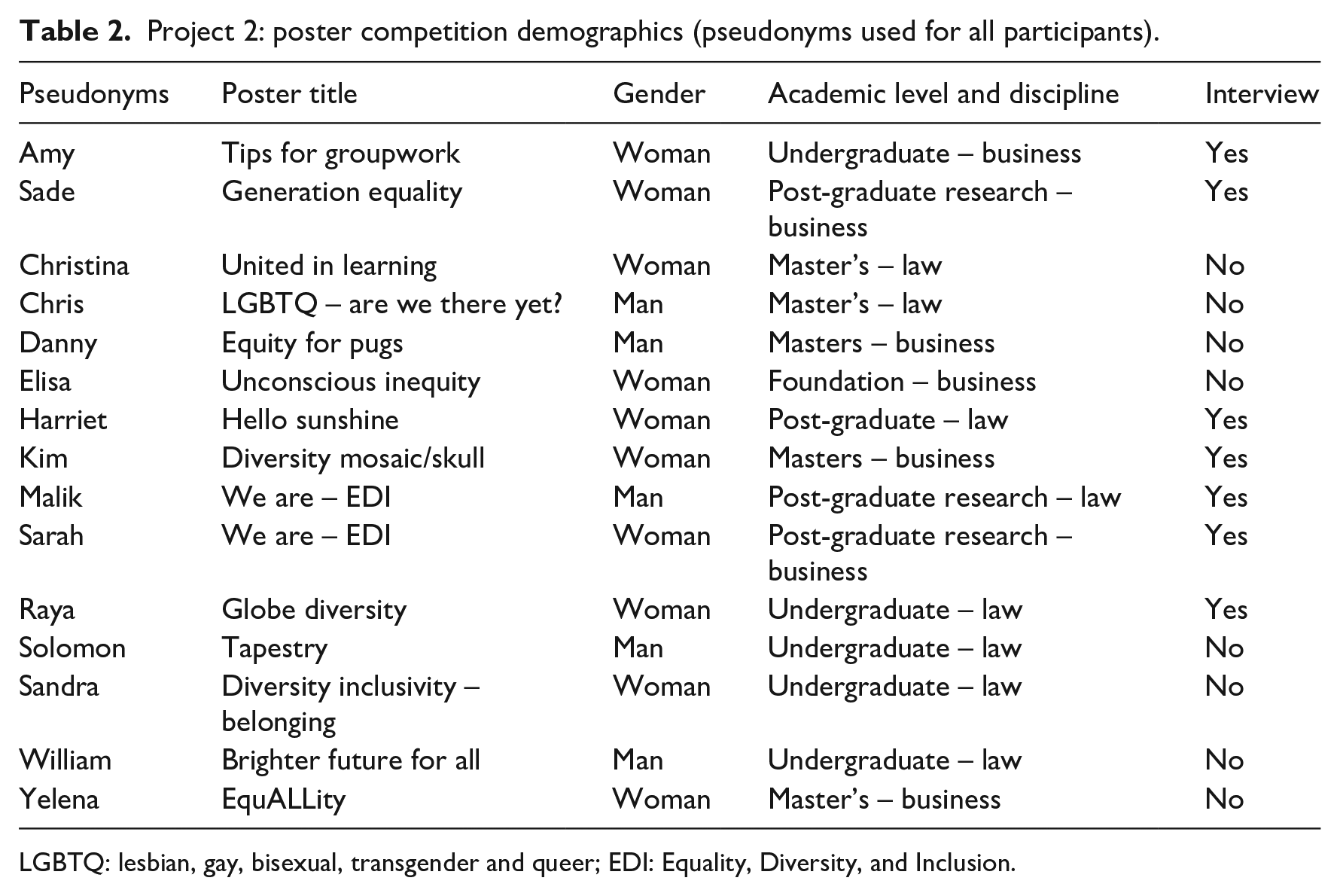 Our collaborative process requires that students are given a degree of autonomy, in a utopian sense (Knights and Willmott, 2002), whereby the guided, formal, lower-risk classroom approach is set aside in favour of higher risk, but potentially transformative extracurricular process of students leading the shared learning activity with staff. By working alongside these students, we observed many becoming empowered, critical thinkers, free to challenge the ‘rules of the game’ (Bristow et al., 2017; Shore and Davidson, 2014), which may serve them well both in their university and their future organisations. Importantly, the critical reflexivity (Cunliffe, 2009), interpersonal relationships (Semper and Blasco, 2018) and praxis (Freire, 2005) that this partnership provoked in us, as educators and researchers, gave us unanticipated cause to celebrate and share the fruits of our partnerships, through workshops and displaying the printed posters. Our affective solidarity (Vachhani and Pullen, 2019) in JEDI work with our student partners offers a different pedagogical foundation to challenge the drift towards managerialism and transactional individualism within universities. The two projects also instilled in students the importance of acting as responsible citizens (Dewey, 1916; Labaree, 1997) embodying the principles of democratic equality by sharing what they have individually learned.