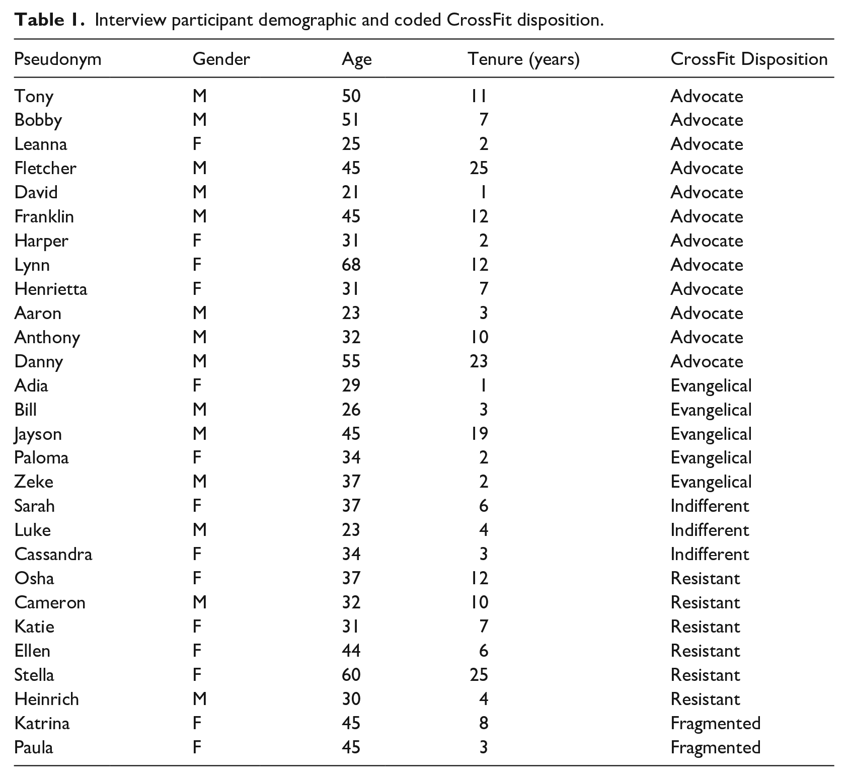 Eric coded participants based on their self-perceived predispositions to the SportsCo CrossFit workplace health promotion (see Table 1). Twelve participants were coded as advocates for CrossFit. Five were coded as CrossFit evangelicals – those who, for example, were CrossFit trainers, opened their own CrossFit gym, competed in tournaments, or stressed the nutritional-lifestyle components to friends/family. Such moralistic zeal has been described in previous studies of normative control systems (see Barker, 1999; Kunda, 2009), and connects with the puritanism within exceptionalist discourses described above. Meanwhile, six employees were openly resistant to the programme for various reasons, three were indifferent, two had mixed feelings (coded as fragmented) about CrossFit.