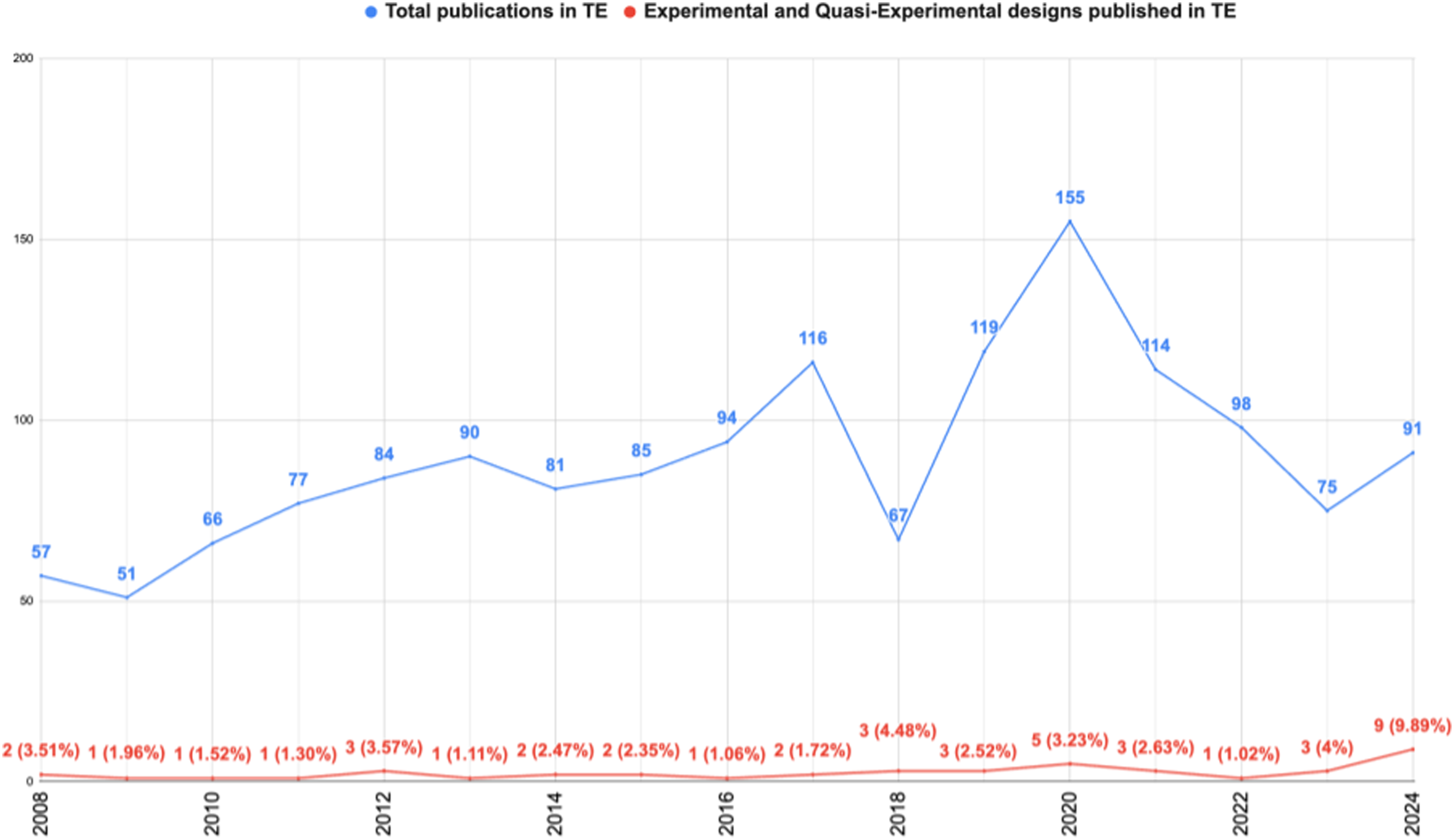 Experimental design in tourism, though emerging, remain in an embryonic stage. To examine the adoption of experimental design in Tourism Economics, following an approach by Souza-Neto et al. (2023), we accessed the Web of Science platform to retrieve metadata for all articles published in the journal from 2008 to 2024. We selected 2008 as the starting point because it marks the first year in which any of our Boolean search terms (experiment, quasi-experiment, “randomi?ed control trial”, or RCT) appeared in the journal’s metadata. Using these terms in the Topic field (title, abstract, and keywords), we initially identified 42 papers potentially employing experimental or quasi-experimental methods. After full-text screening, two papers were excluded for not meeting empirical or methodological criteria (e.g., meta-analysis; non-experimental time-series analysis). Our final sample comprises 40 papers, forming the basis for the subsequent analysis. Some experimental studies may not explicitly state their methodological approach, a limitation previously observed in systematic reviews of experimental research (e.g., Demeter et al., 2023).