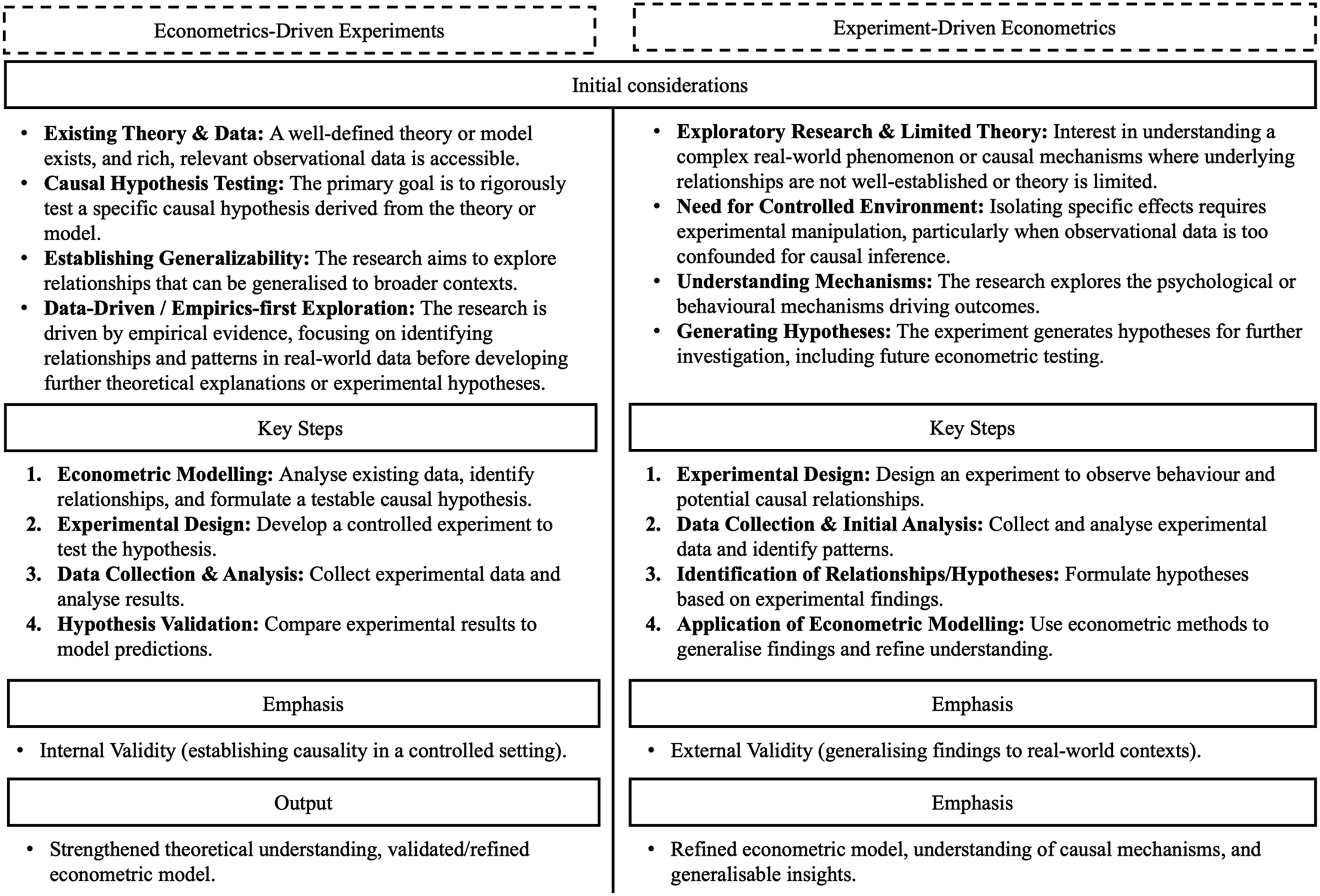 Laboratory experiments offer greater internal validity compared to field data (Roe and Just, 2009). Combining them with observational and econometric methods helps ensure that findings accurately reflect cause-and-effect mechanisms. This strengthens theory testing while also improving internal validity and allowing for a broader generalization of results. Additionally, laboratory experiments help explore underlying processes that are difficult to observe in the field, further reinforcing their theoretical contributions (Blanchard et al., 2022). Concomitantly, econometric methods rely on observational, non-randomized data to improve external validity by demonstrating the generalizability of findings to real-world contexts. Researchers should explicitly articulate how observational data contributes to their goals. This may involve addressing ecological validity, exploring long-term behavioral patterns, or extending experimental findings to broader contexts. For example, in tourism economics, laboratory experiments can examine how loss aversion influences consumer decision-making in response to different pricing strategies. Econometric analysis can then assess the long-term impact on purchasing behavior using longitudinal data.