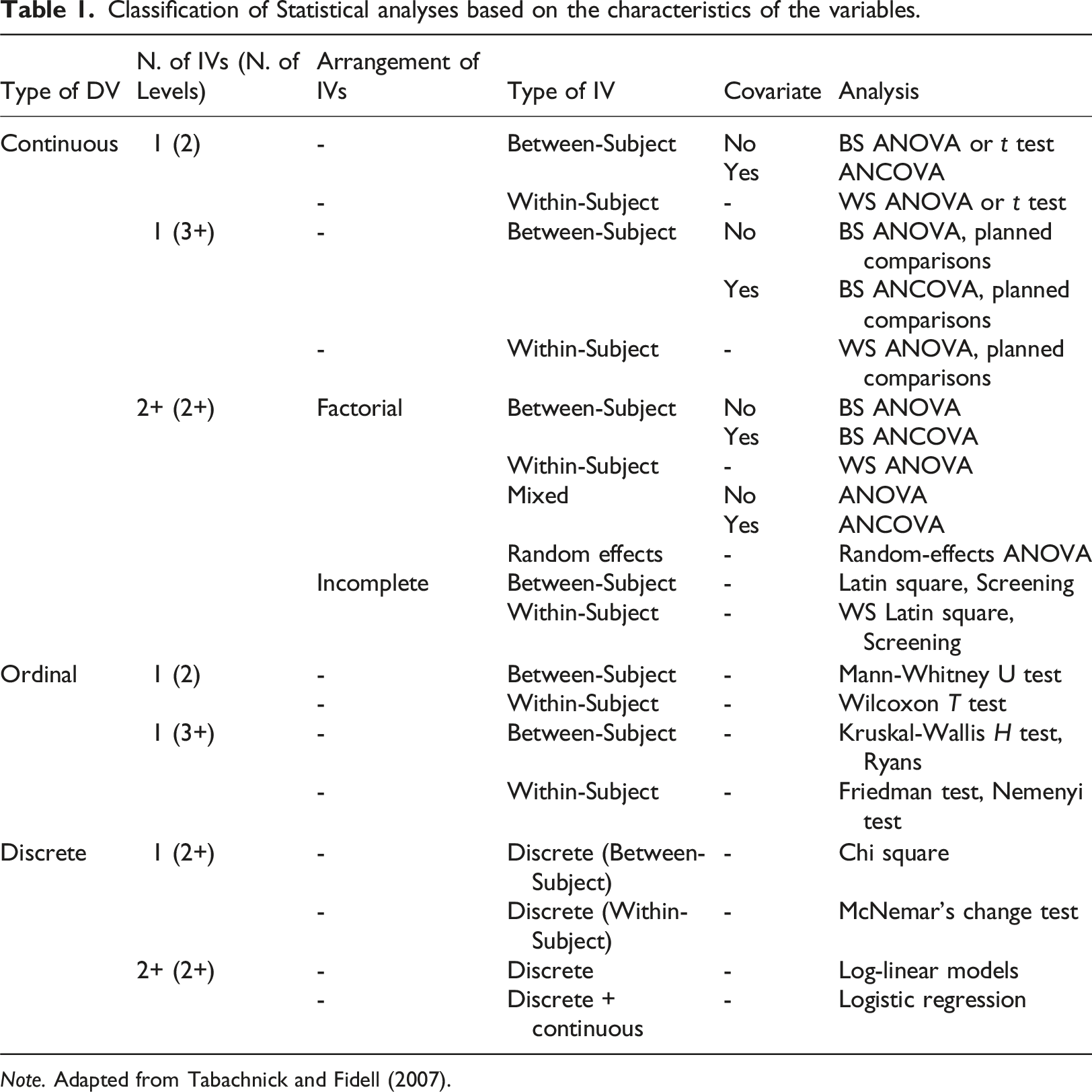 The selection of appropriate statistical analysis is a topic tourism economists are recognized for their expertise across the globe. While it is outside the scope of this manuscript to explore statistical choices in depth, it is important to highlight a few key considerations. The appropriate analysis depends on several factors, such as the type of dependent variable (DV) and the number of levels in the independent variable (IV). Other considerations include the arrangement of IVs (e.g., between-subjects, within-subjects, or mixed designs), whether the IV is discrete or continuous, and the inclusion of potential covariates. Proper classification ensures the validity and reliability of results while aligning with the complexity of the research design. Based on the guidelines from Tabachnick and Fidell (2007), common statistical methods are categorized to address various scenarios.