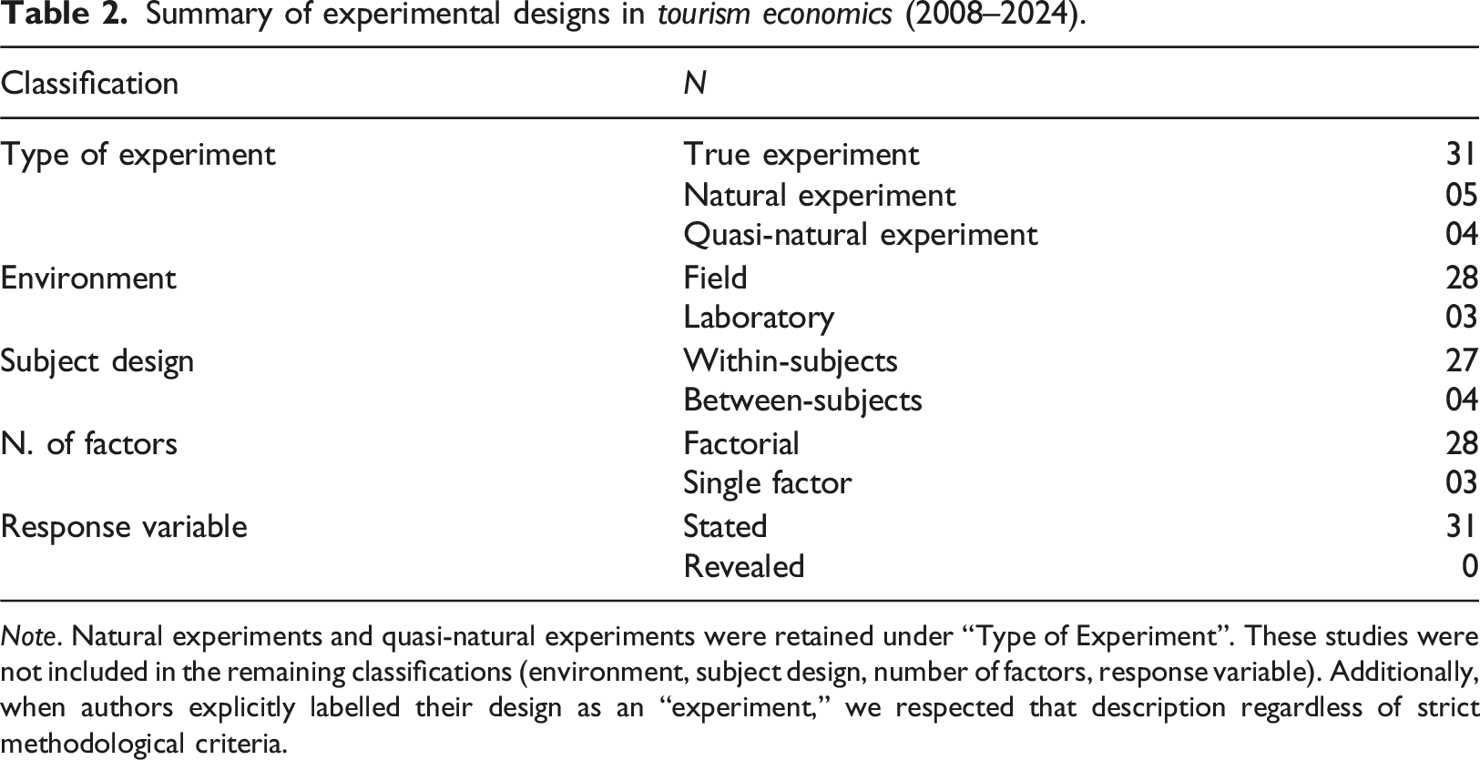 While a detailed review is beyond the scope of this manuscript, we refer readers to Viglia and Dolnicar (2020) for further discussion. Experimental economists who note empirical studies in tourism often draw on approaches from psychology, behavioral economics, marketing, and technology sciences. These perspectives help explore the behavioral mechanisms of tourism stakeholders’ decision-making (Dolnicar et al., 2024). Despite the progress, experimental methods remain relatively uncommon in tourism economics. Fewer than 10% of articles in leading tourism journals use experimental approaches (Viglia and Dolnicar, 2020). Even fewer studies that apply experimental design are specifically embedded in the Total publications and (Quasi)Experimental designs in tourism economics.