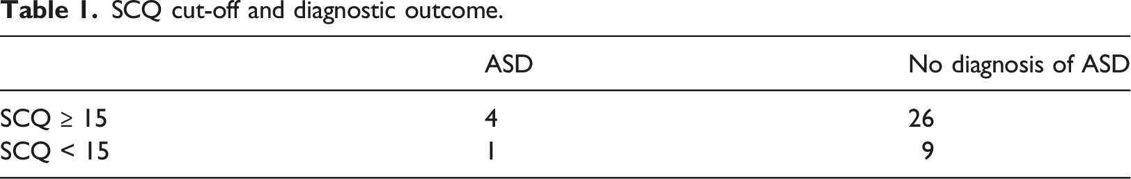 Forty young people (mean age 13.75 years) were screened using the caregiver reported SCQ before completing ‘gold standard’ assessment.